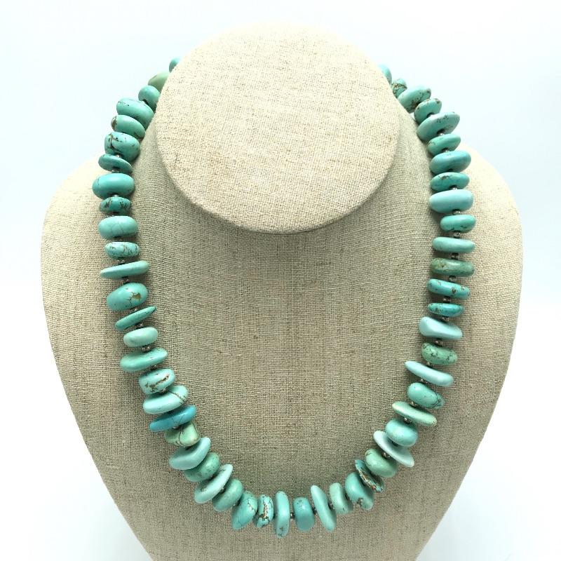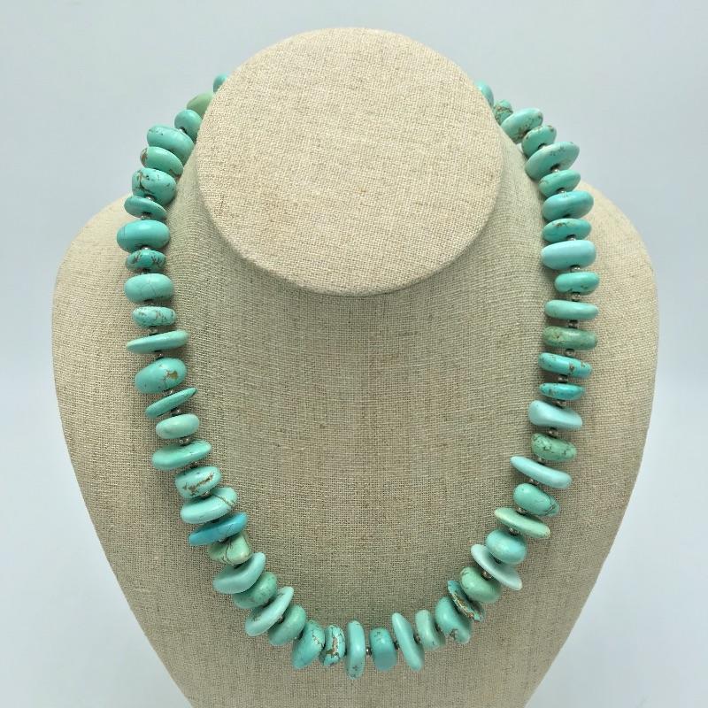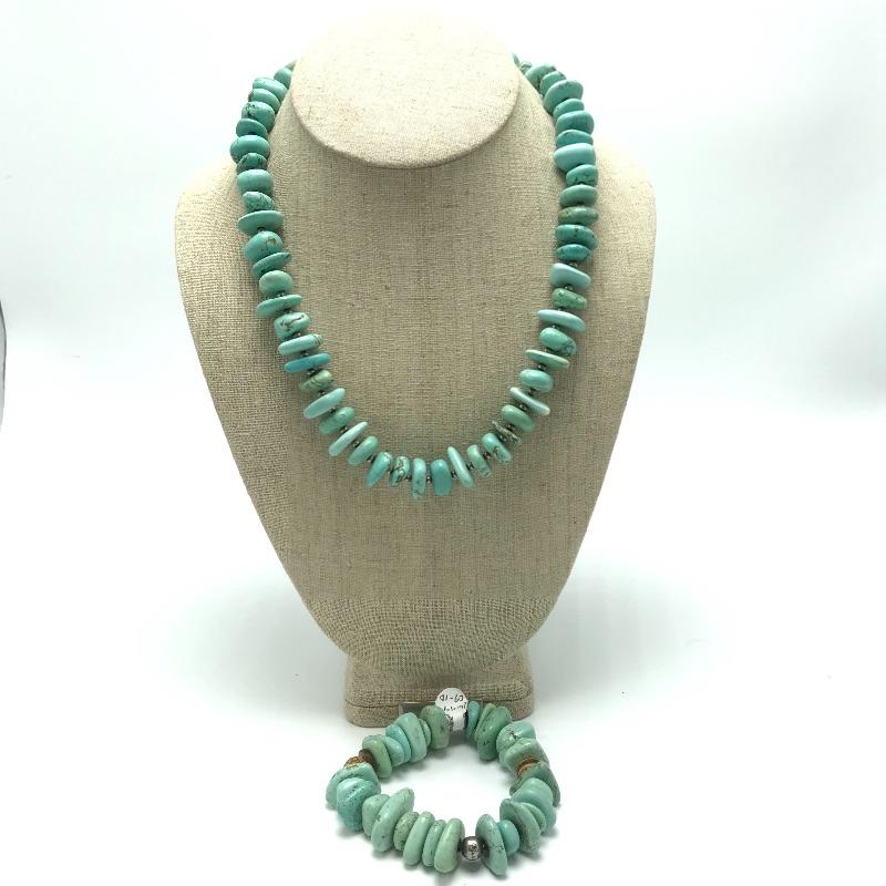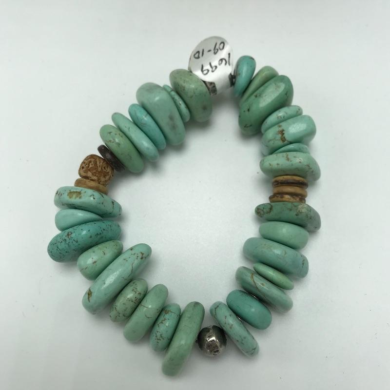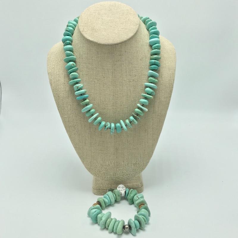 Blue-green howlite with sterling silver and lobster clasp 20” necklace paired with a matching blue-green howlite stretch bracelet. The bracelet also contains mahogany seed, coconut shell and sterling silver. The Silpada catalog states bracelet fits a 7” wrist. See photos.