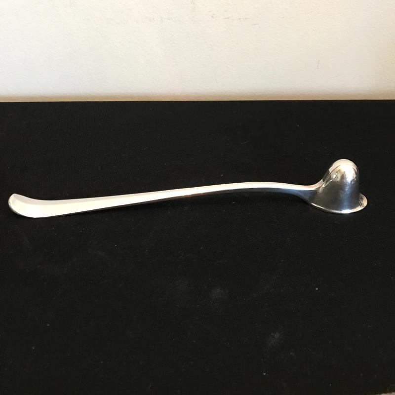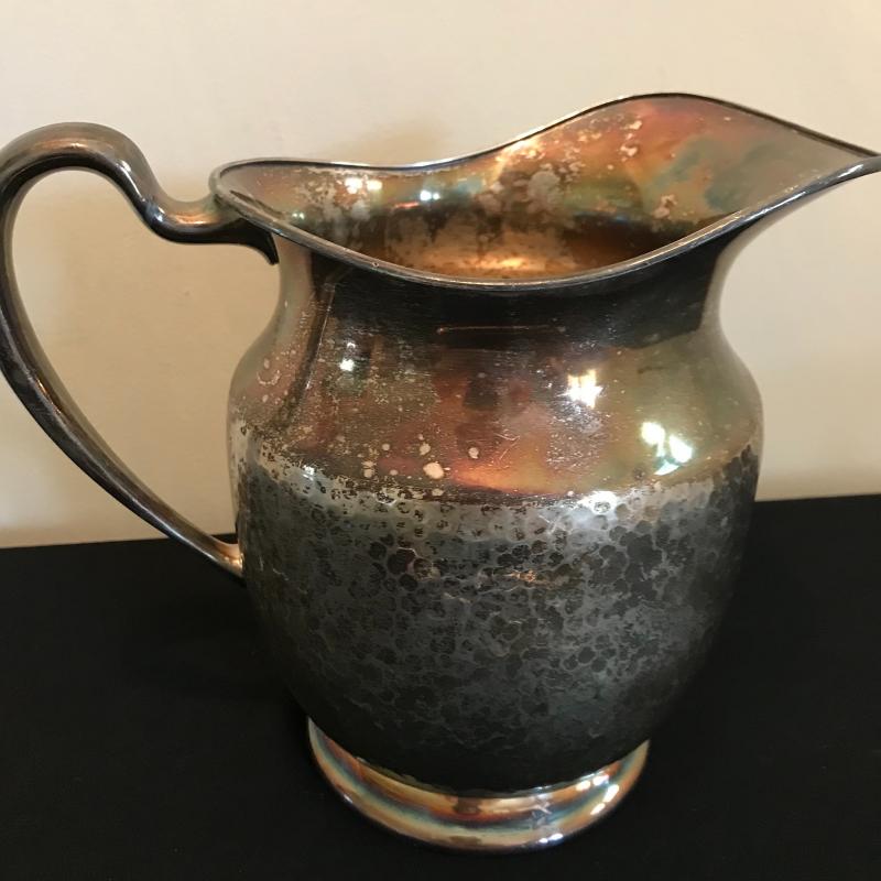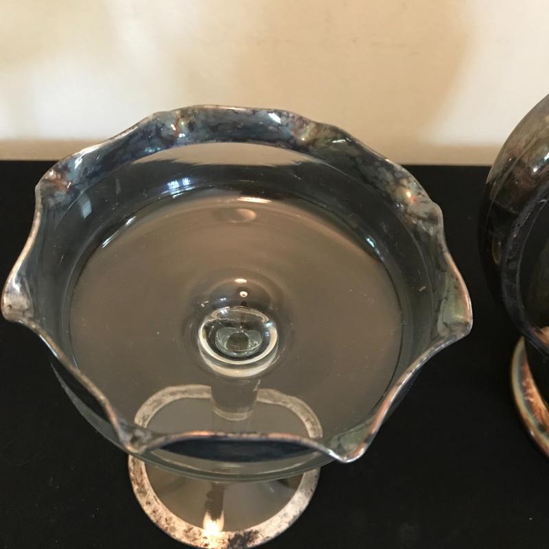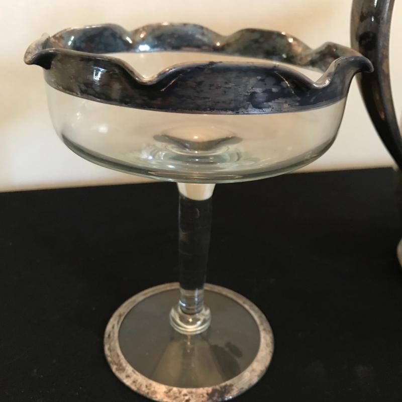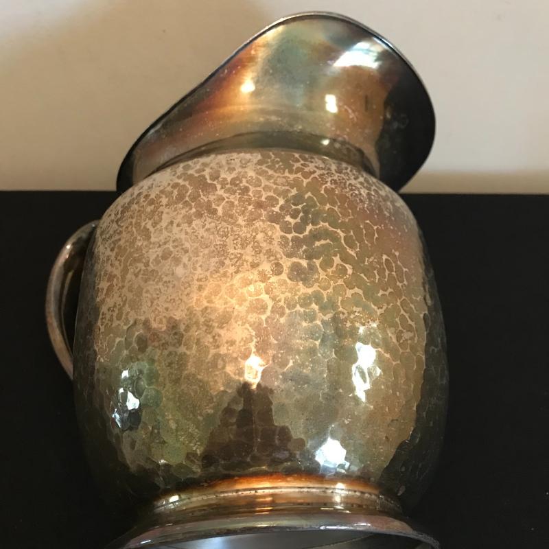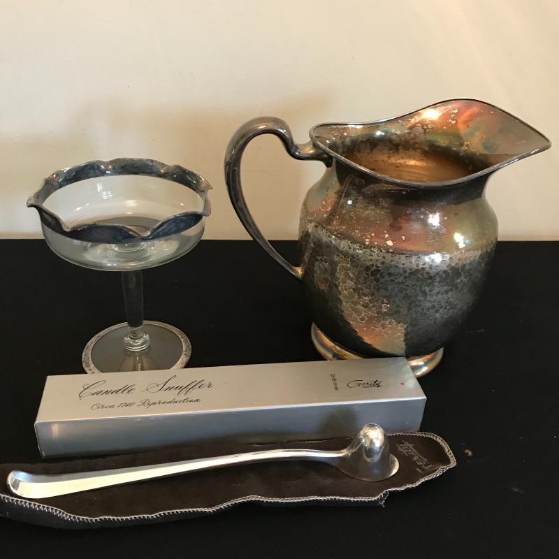 Unique wine glass with silver painted rims and with a hammered pitcher measures approx. 7.75” tall, Candle snuffer by Gerity, still with satchel and box has been used but in nice condition. Local pick up only.