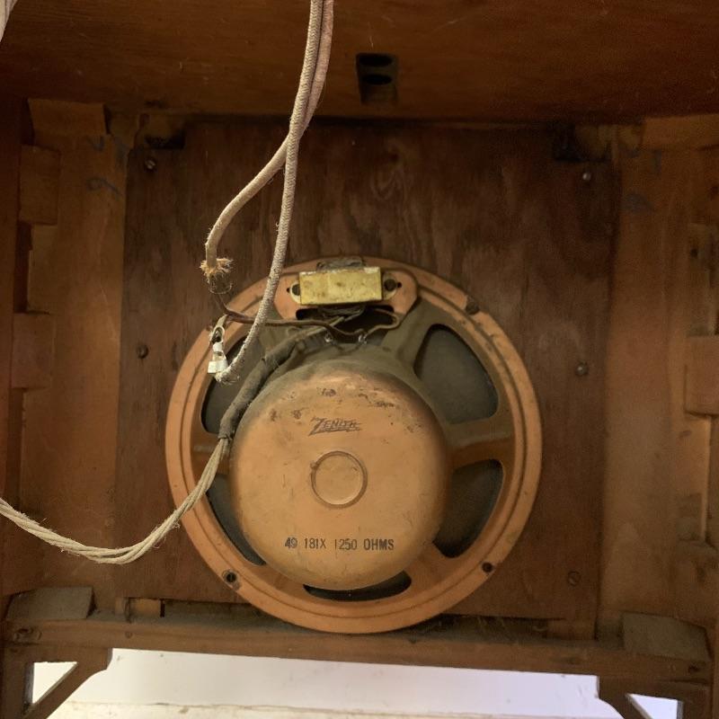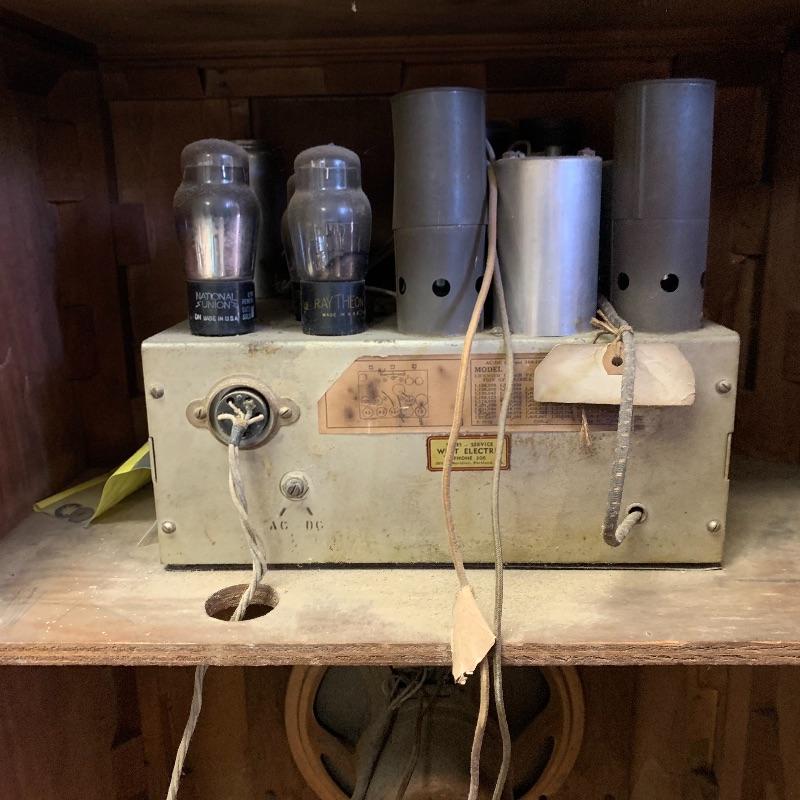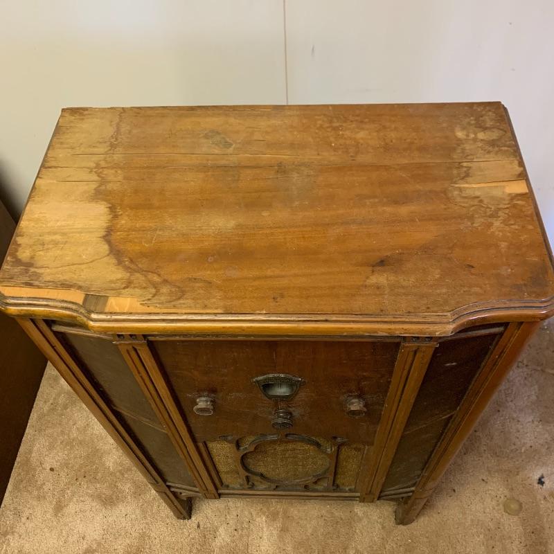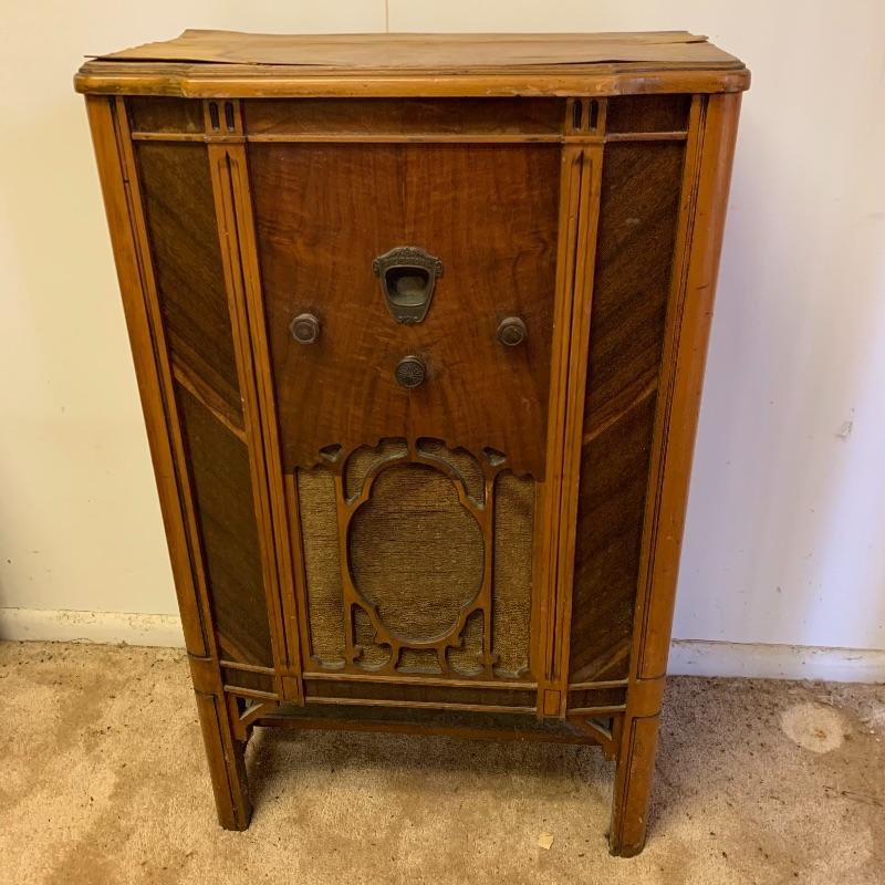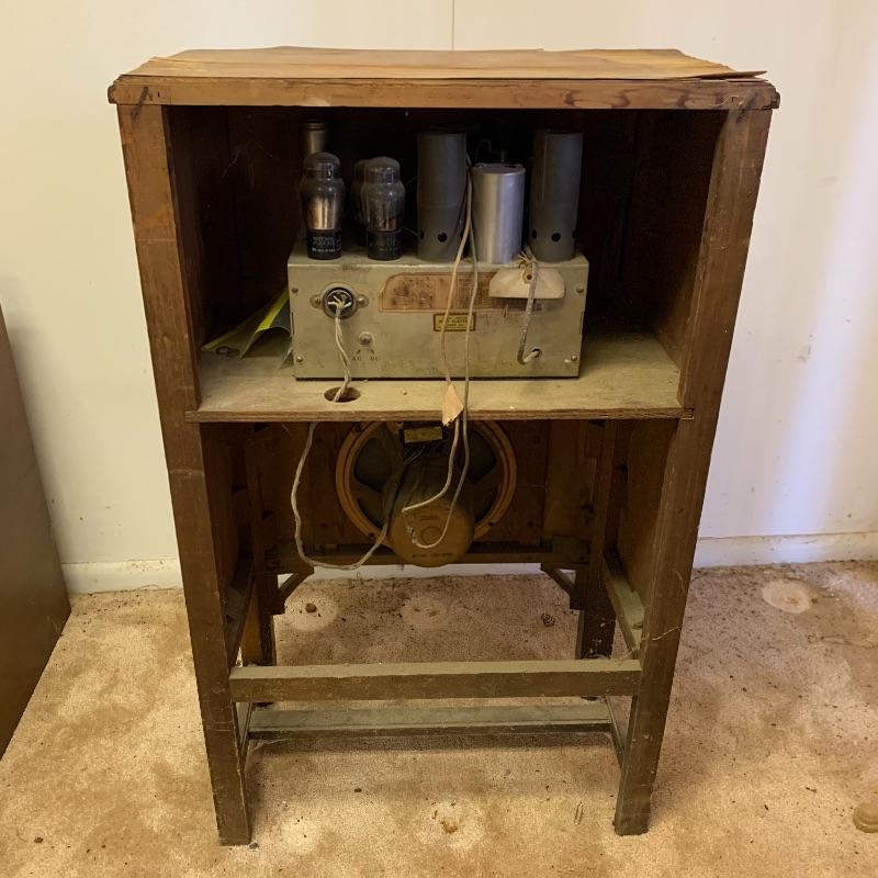Silvertone Superheterodyne radio with tubes. Wooden unit. Model number is illegible. Unit is sturdy, but finishing is worn. Measures 12” x 22.5” x 37”.