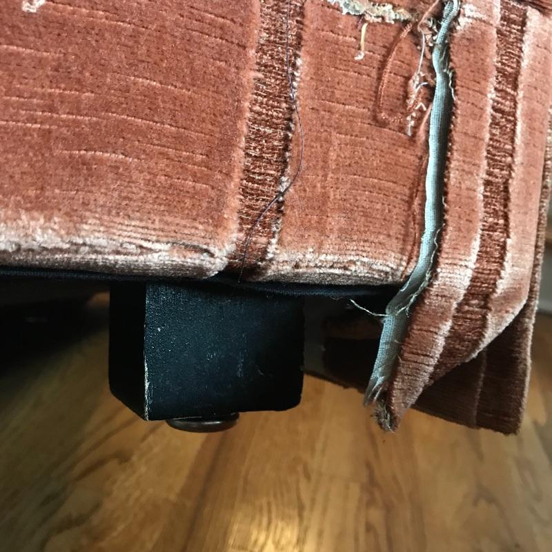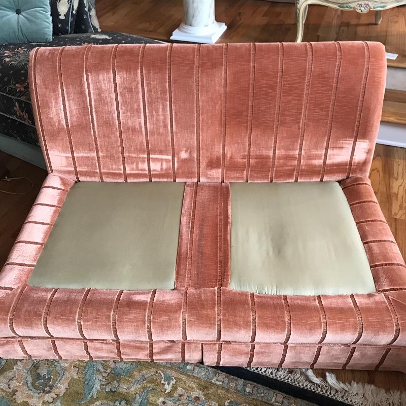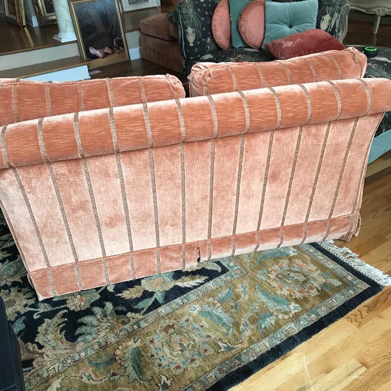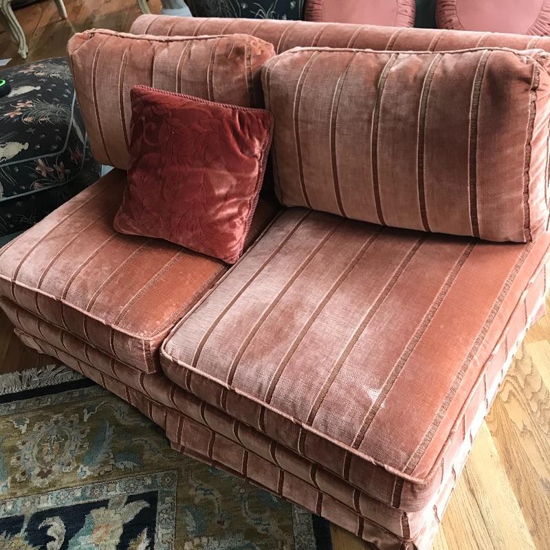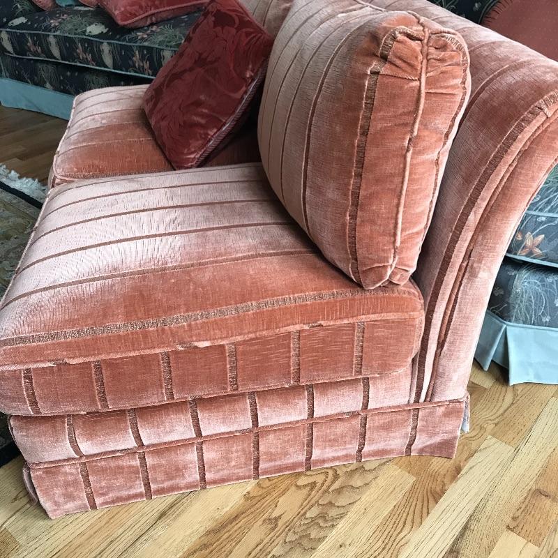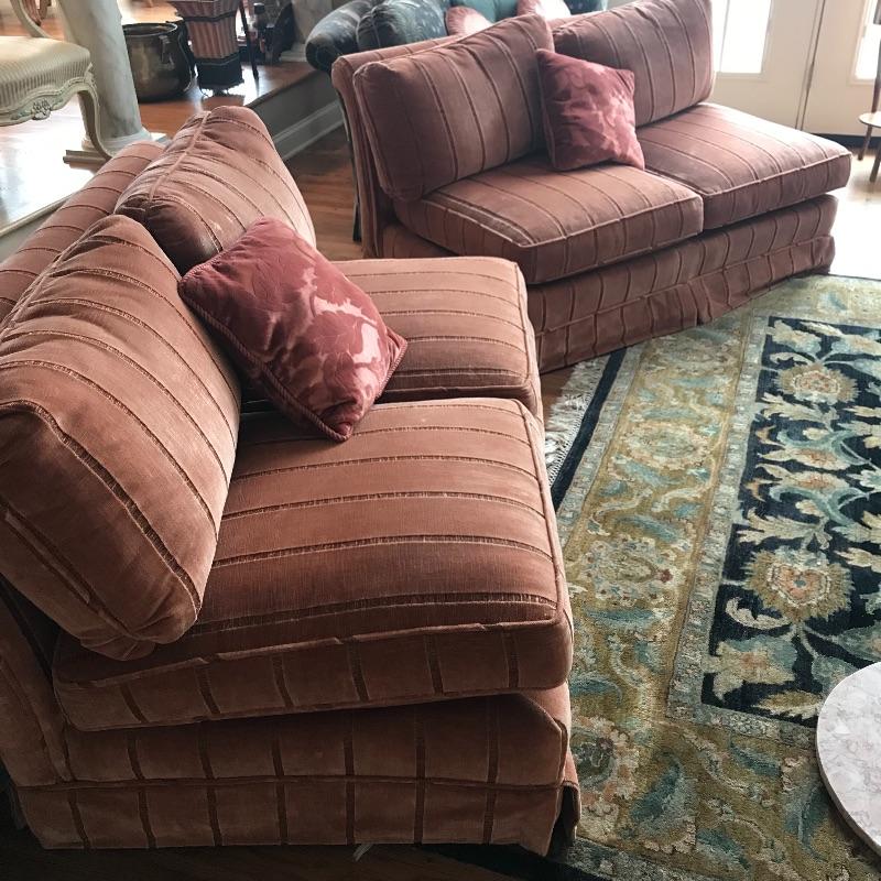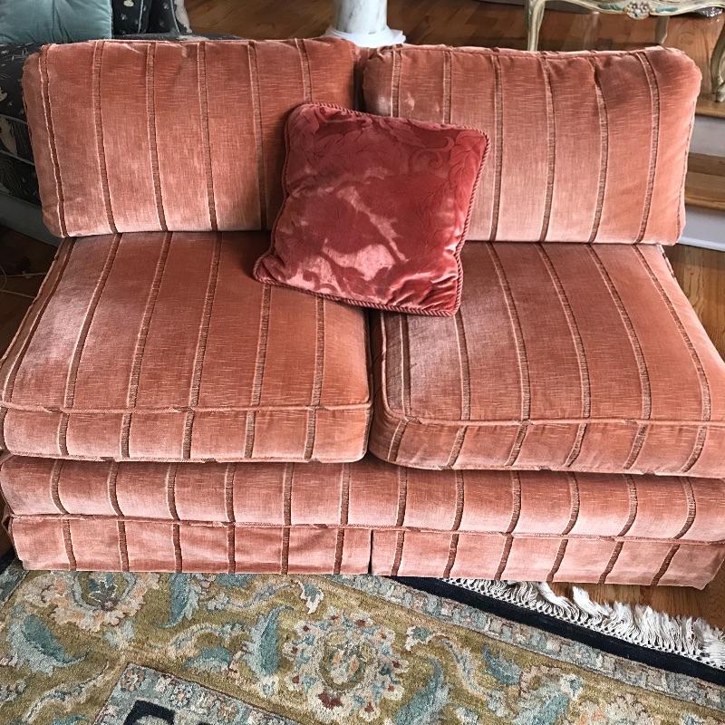 Two matching small burnt orange sofas sans arms with velour style fabric. All cushions and matching leaf throw pillows have zippers to remove cushions. Sofa beneath cushions appears pristinely clean. Sofas measure 50” x 35” x 28”. Local pick up only. Please bring help to load.