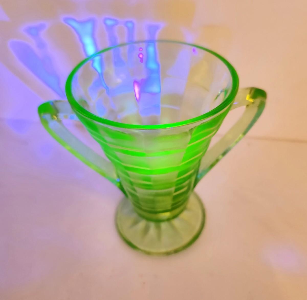 Is it a glass? A Vase? We're not sure! Depression era 2-handled vessel that GLOWS then the black light hits it - Unranium/Vaseline glass. Good condition, 4.25" tall.