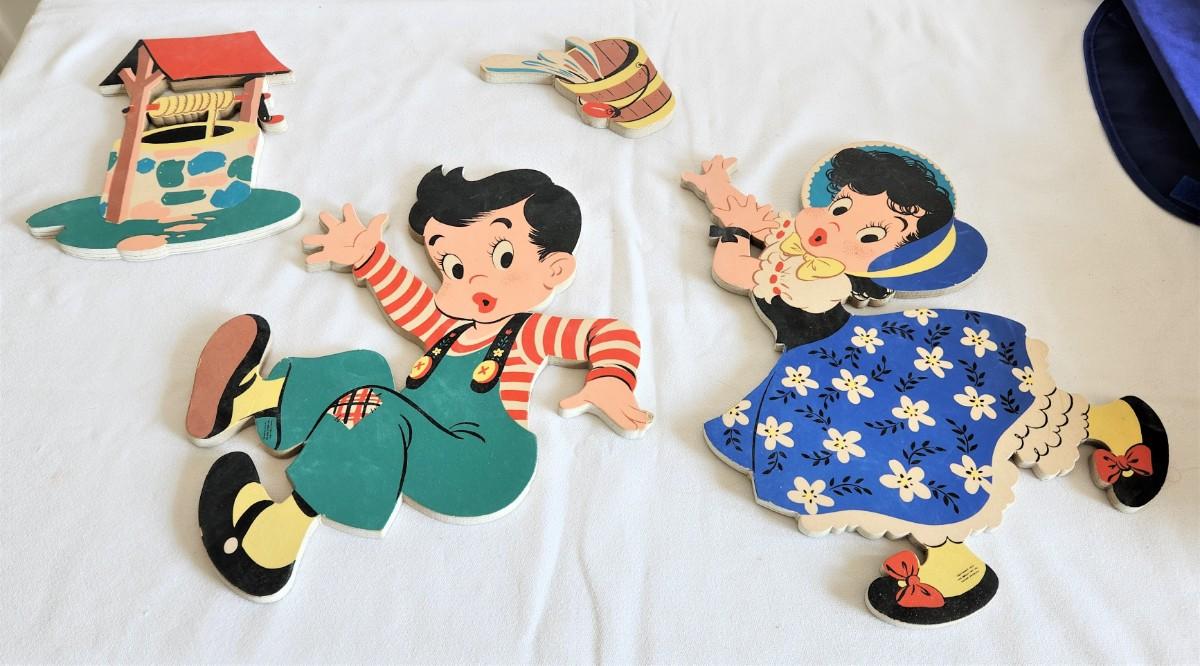 Complete set of Jack and Jill wall hangings for nursery/child's room - made by the Dolly Toy Company in the 1950's. EXCELLENT condition. Jill is 11.75" tall, 7.5" across. Wishing Well is 7.5" tall. Very colorful - made of pressed cardboard.