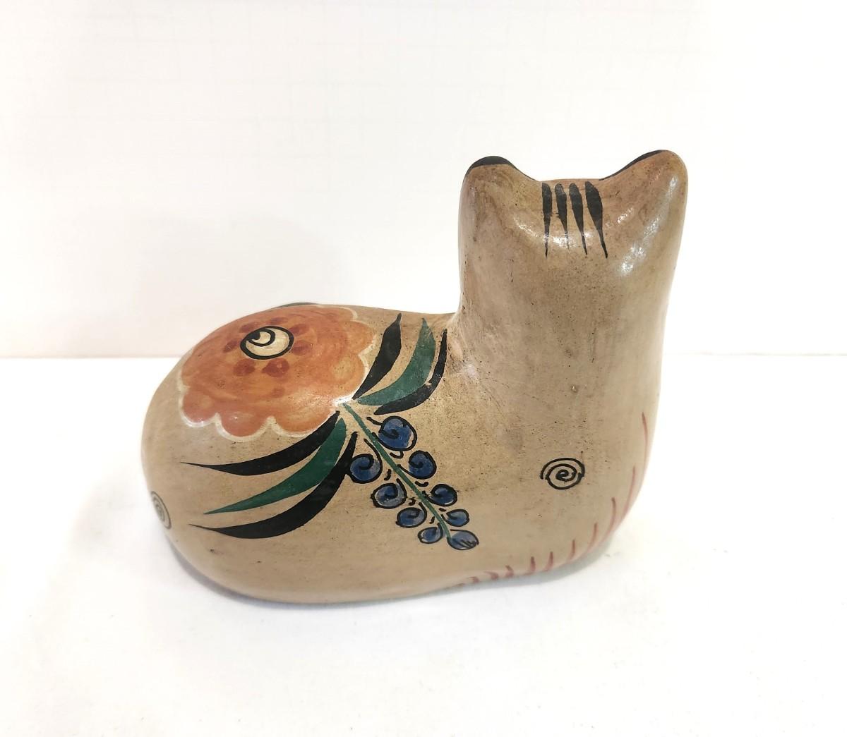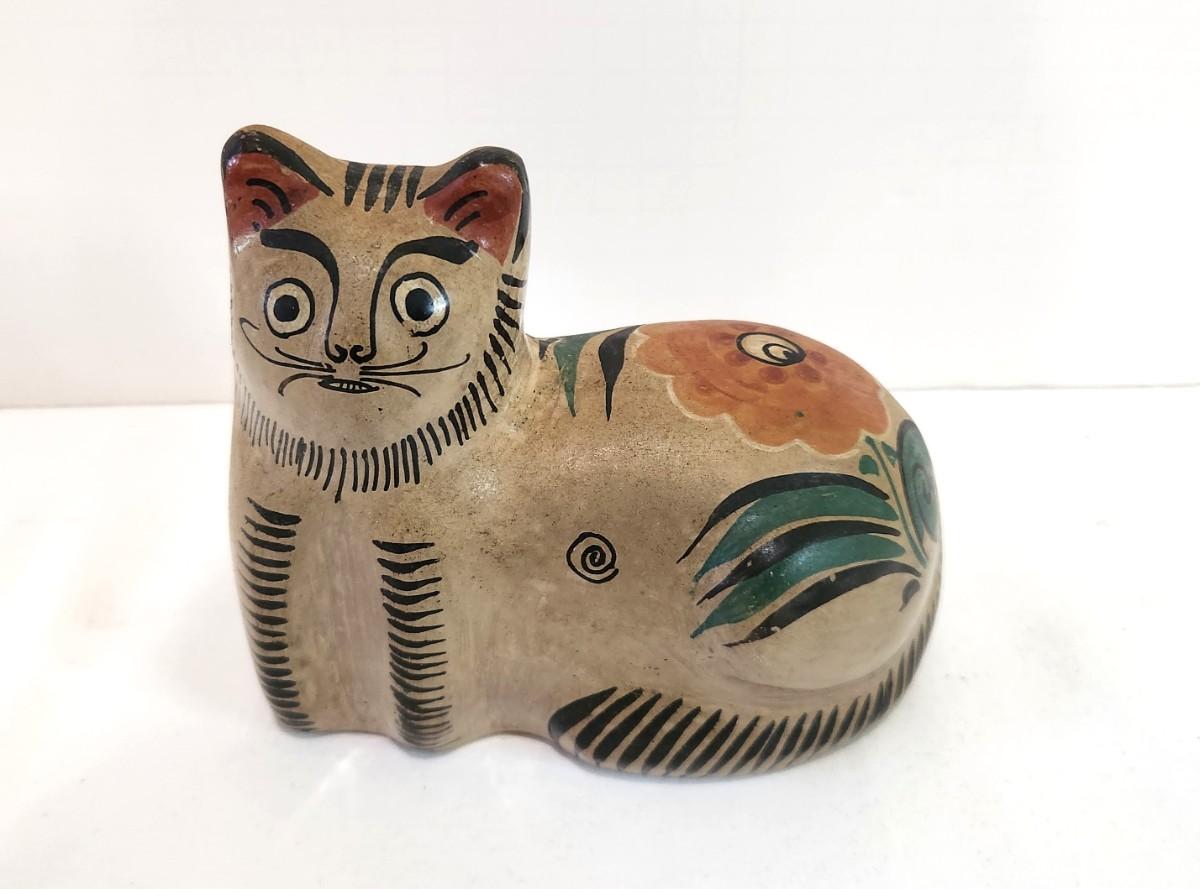 Classic Mexican design - wide-dyed "derpy" looking cat - unmarked, but likely Tonala Pottery. Good condition - 5" tall, 6.4" long.
