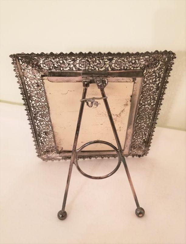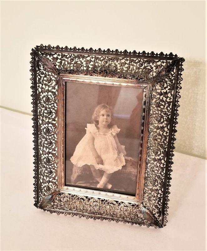 Both the frame and the photo are charming - Vintage pierced silverplate frame measures about 7" x 9". Lovely photo of a young girl - as found. Good vintage condition.