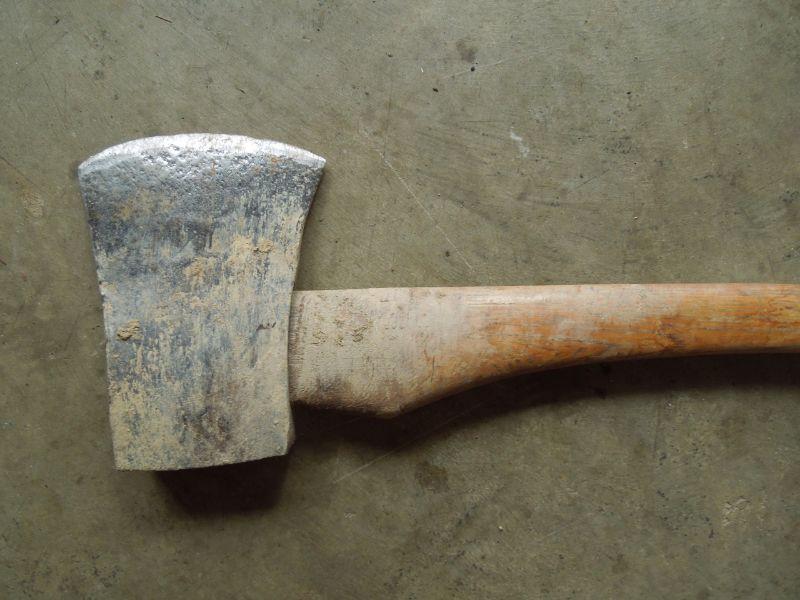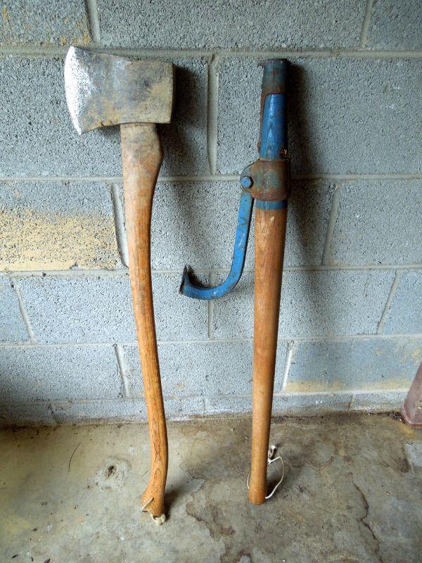 No splits in wood handles. Axe has been sharpened. Log roller works.