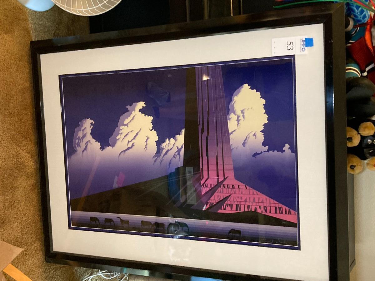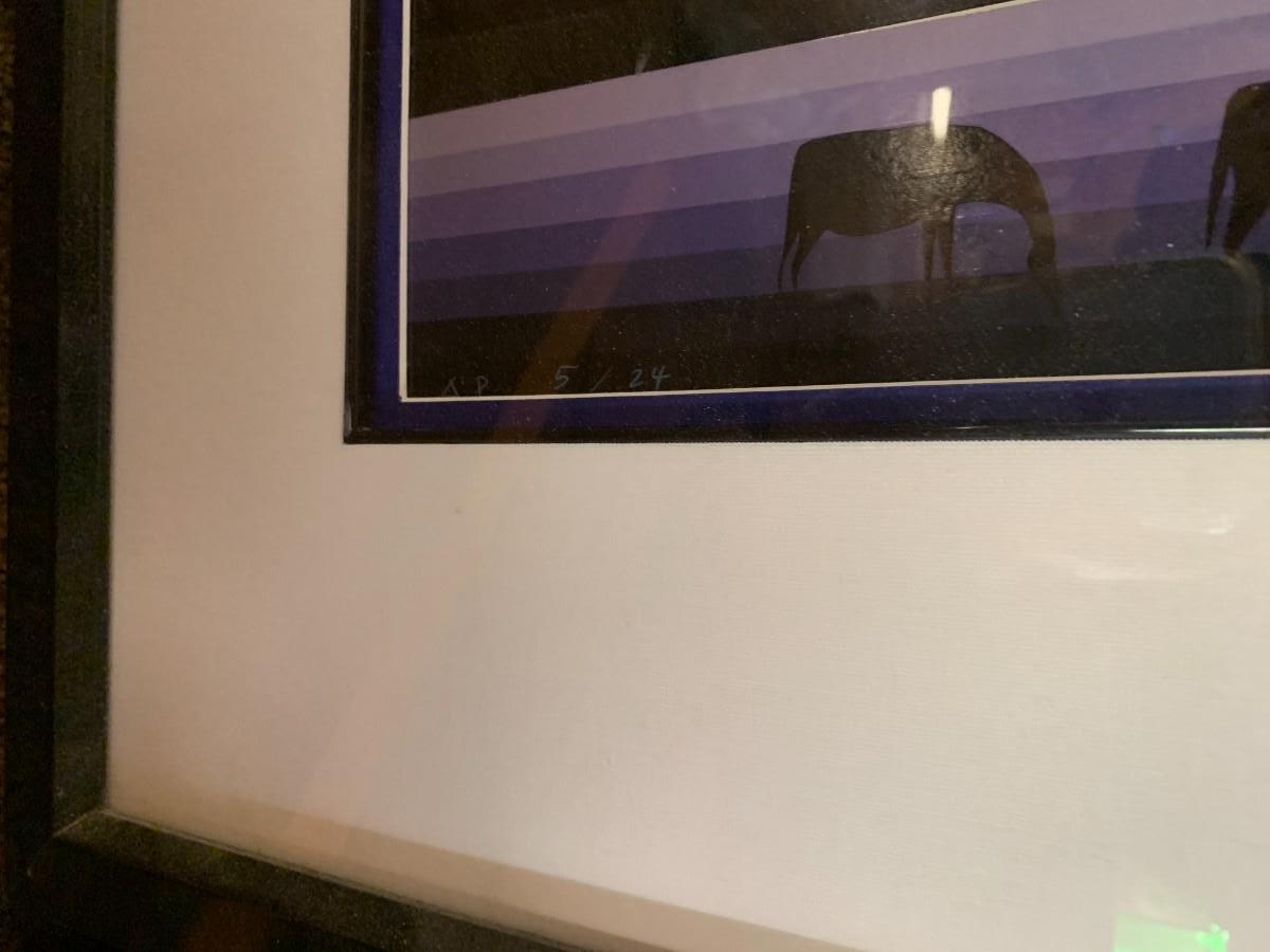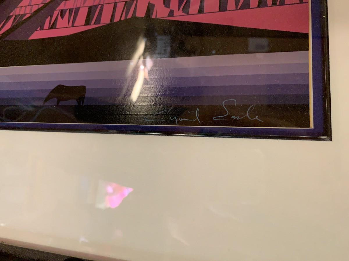 Signed and numbered Eyvind Earle Serigraph. 48x36" framed. Title: Purple Monument. Edition 5/24. Date 1986. Subject: purple, pink mountain with black horses and dark blue sky.