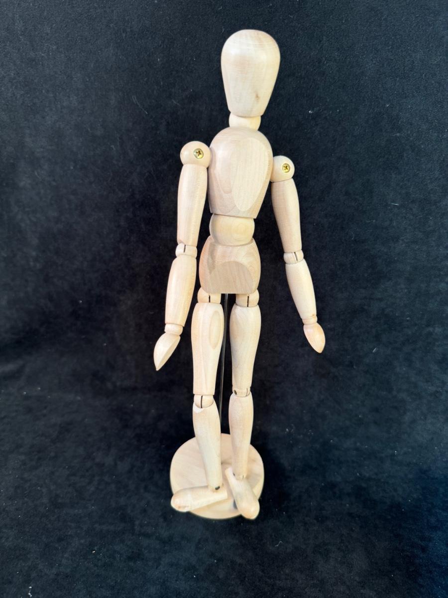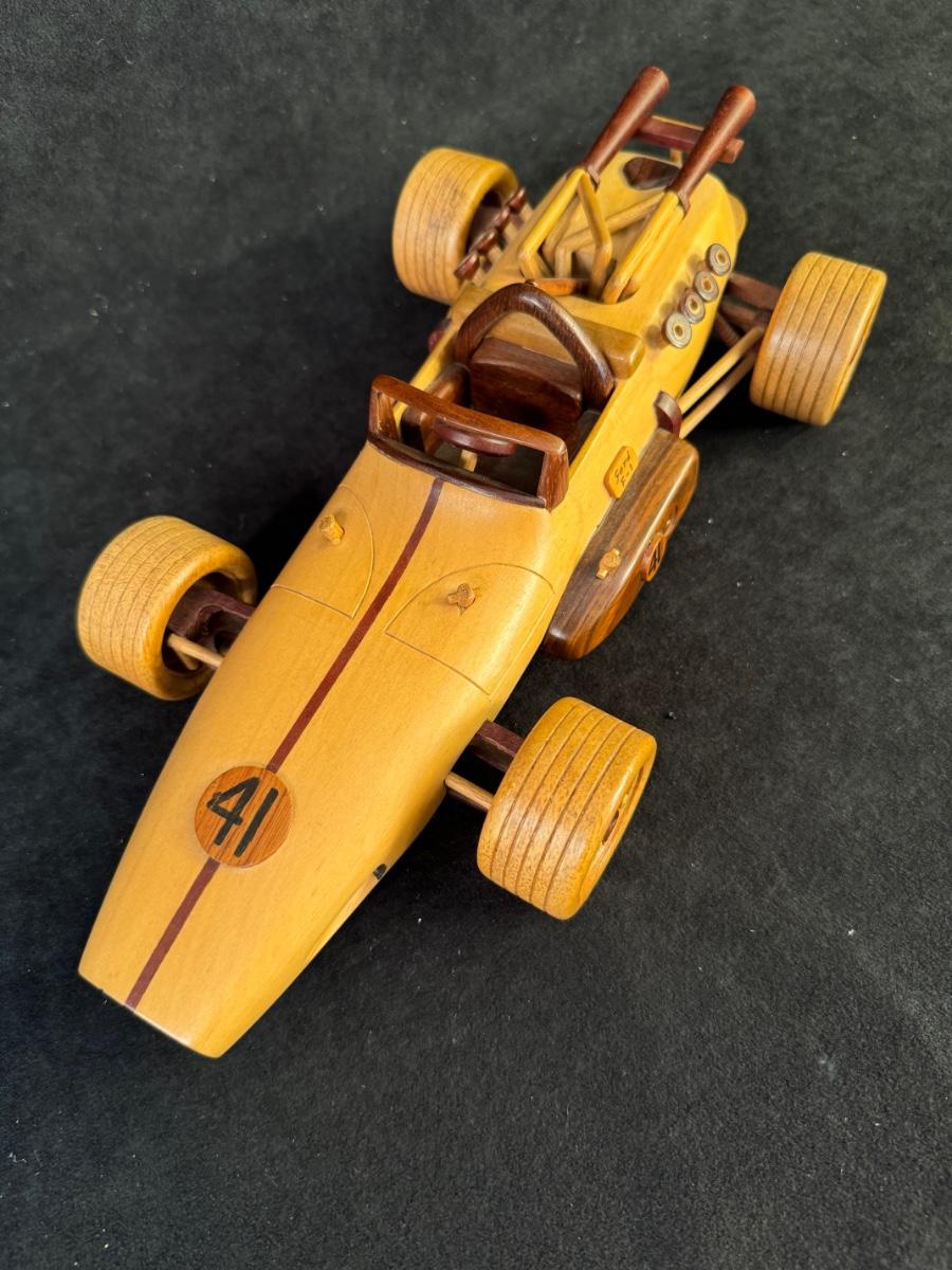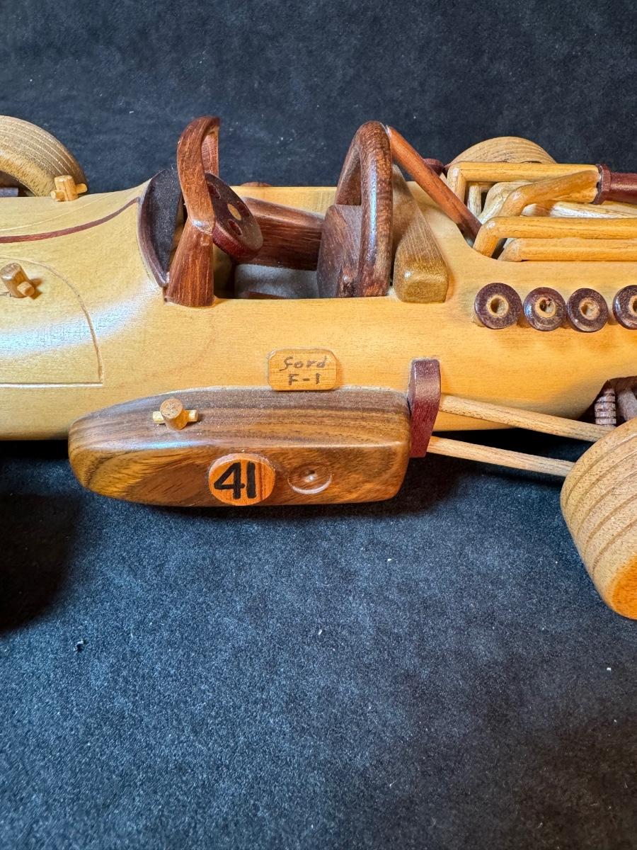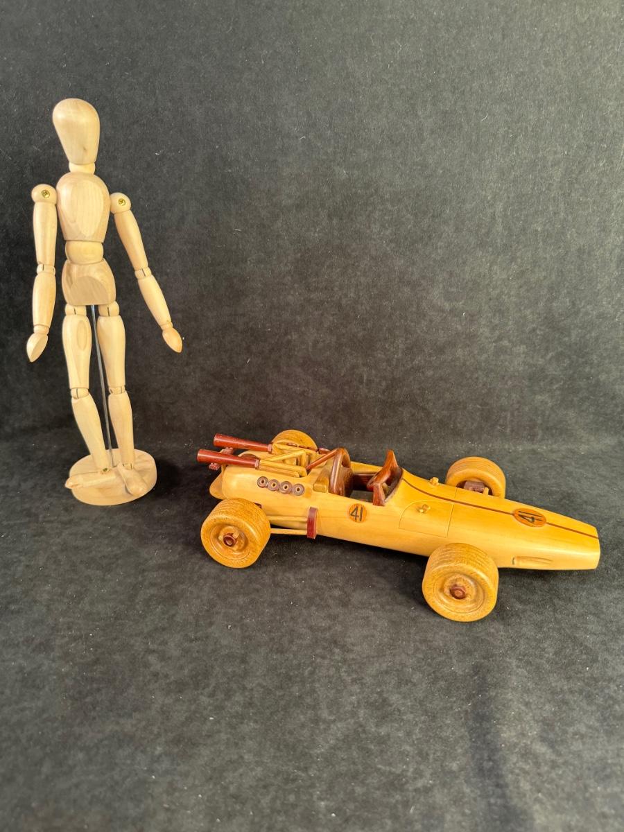 13 1/4” Wood posable man and 6 1/4”W x 13”L wood car