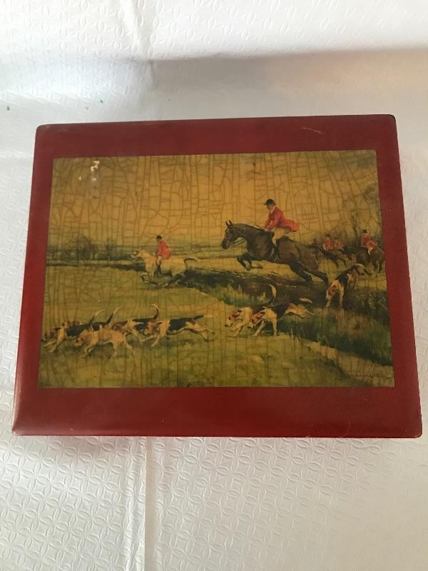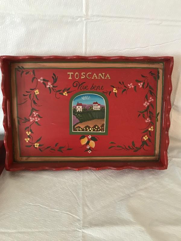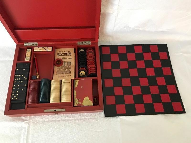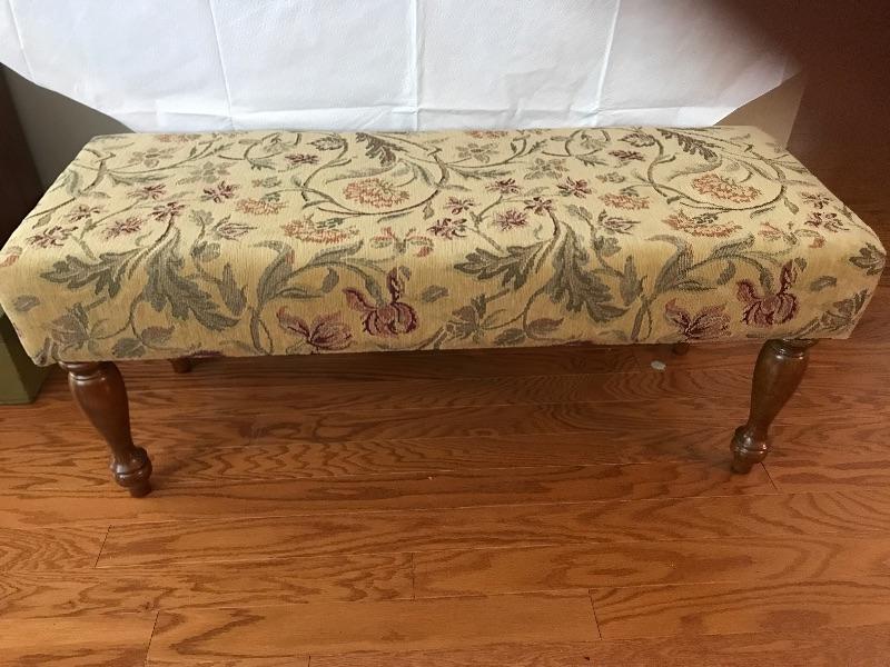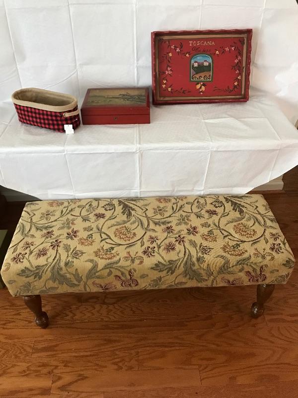 This lot includes an antique game set Dominoes,Parcheesi, Backgammon, Bridge and Checkerboard, small Harry & David basket, Wooden Italian theme tray measuring 18-1/2” by 12-1/2” and an upholstered bench measuring 43” long 16-1/2” deep and 18” tall