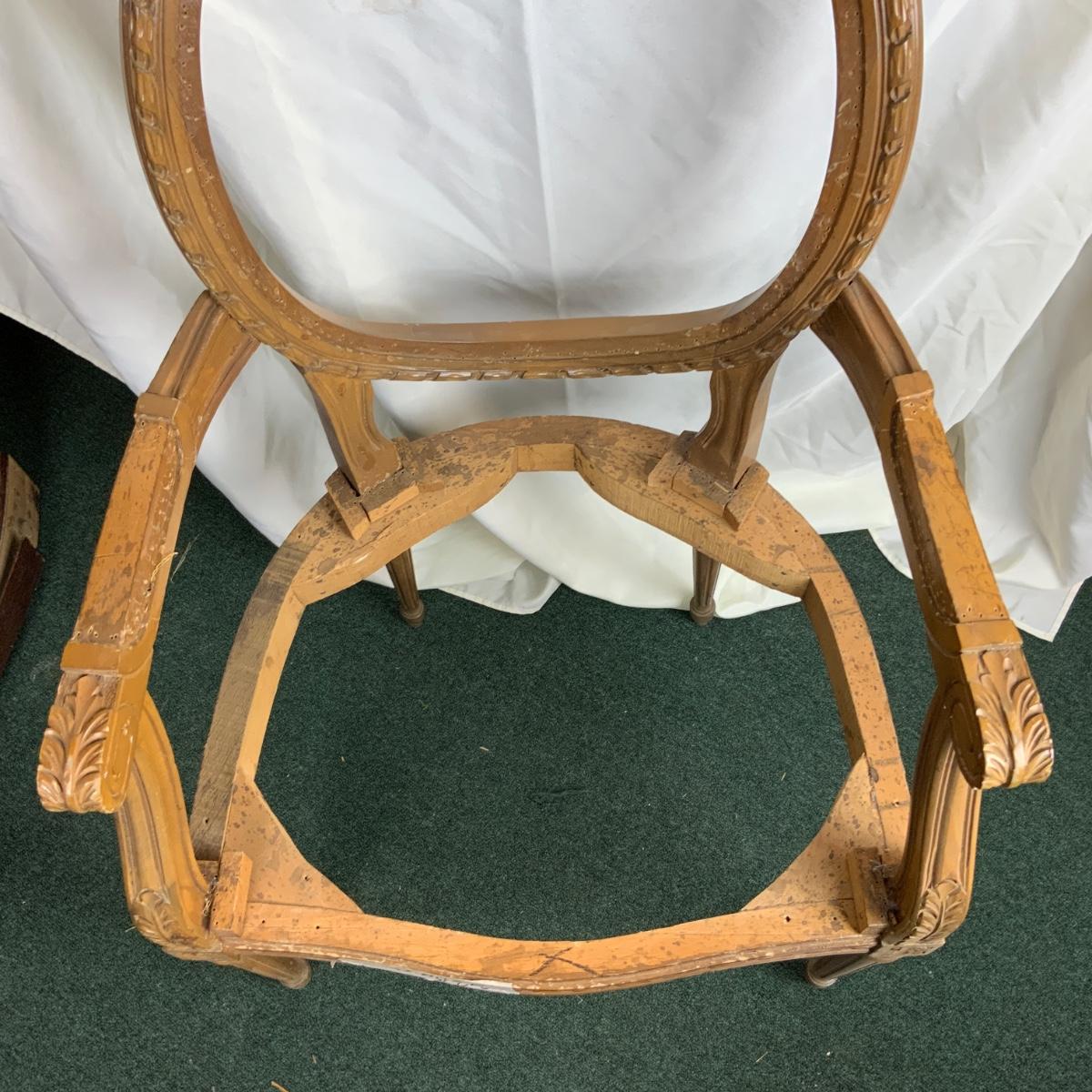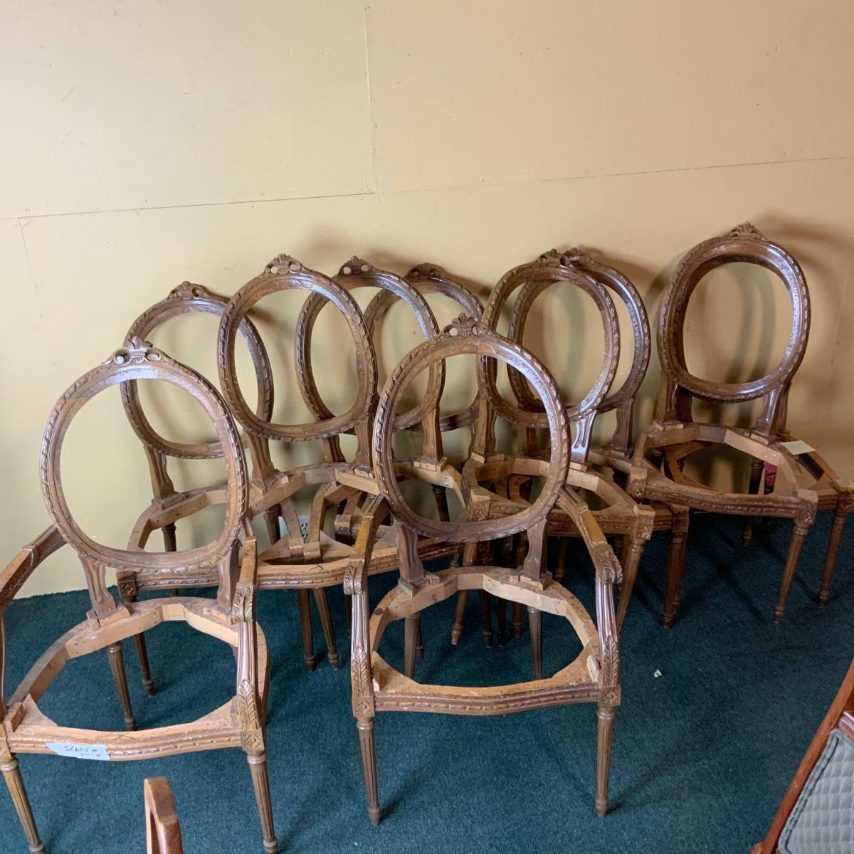 Set of 10 Chairs. Two arm chairs and 8 side chairs. All need new cushions, back and seat. //::\\ Please see photos for details and condition. No attempt has been made to hide any imperfections. All items listed in this auction are warehouse items, and need to be cleaned. A majority of the items need restoration as well. All items are sold AS IS and WITHOUT GUARANTEE. If you are uncertain about an item, DO NOT BID. Due to the nature of this online auction in-person inspection is HIGHLY recommended. All Sales are FINAL. Pick Up Times are FIRM. Please confirm with your own schedule that you can pick up in the scheduled times listed in the Terms and Conditions. Any questions please message the auctioneer. DO NOT Contact The Harp Gallery.