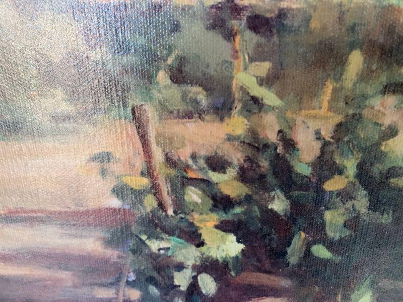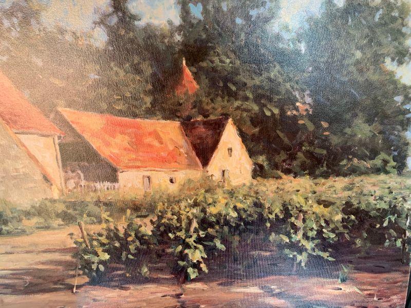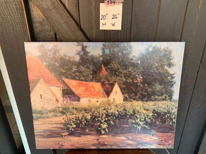 Painting on canvas, building with vines in front