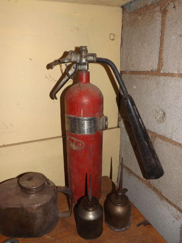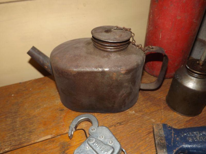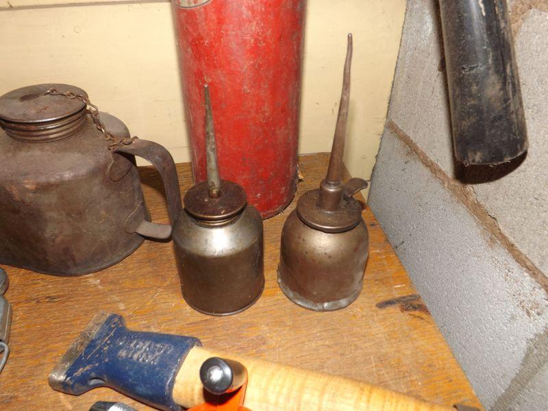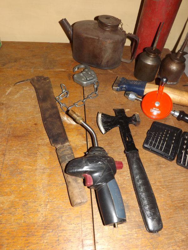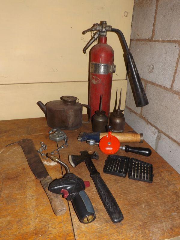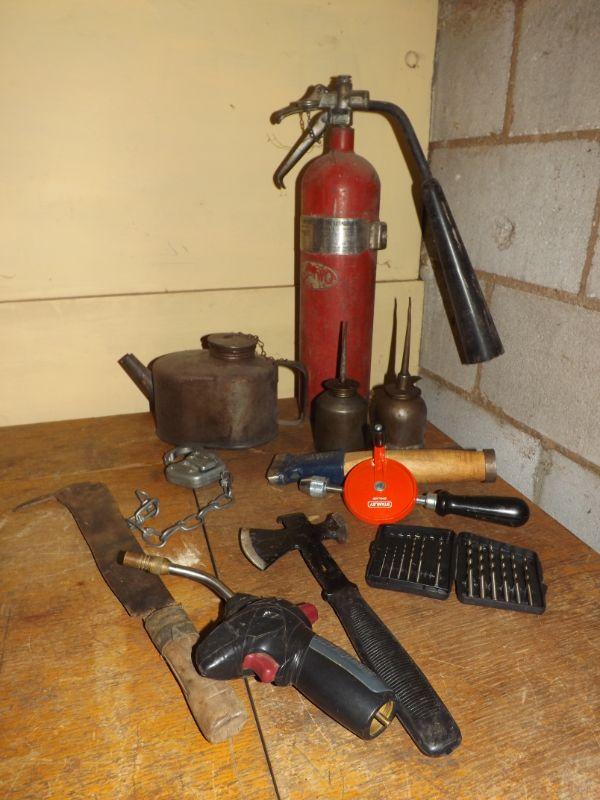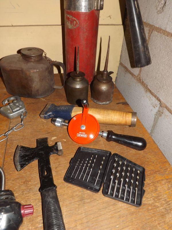 MOSTLY VINTAGE TOOLS OIL CANS, FIRE EXTIGUISHER , HAND DRILL, HAND MADE KNIFE, HATCHET, TORCH, PADLOCK (NO KEY) AND MORE