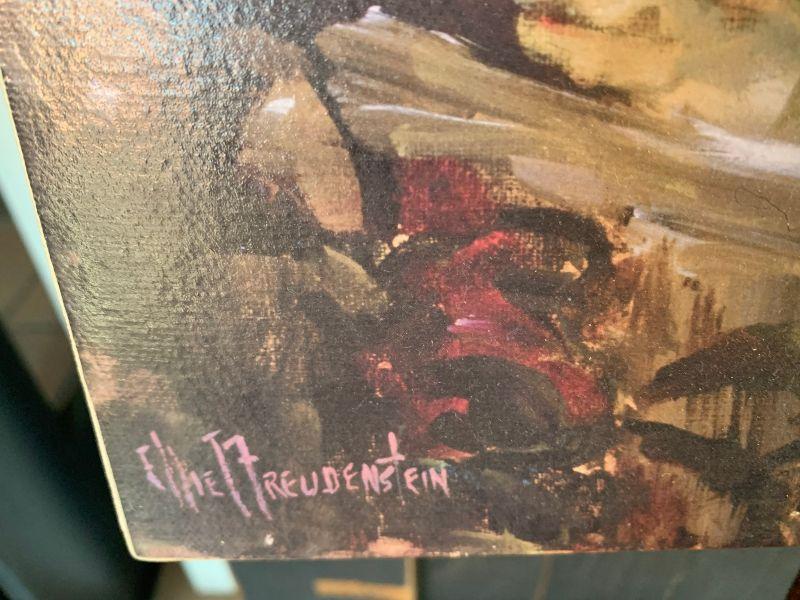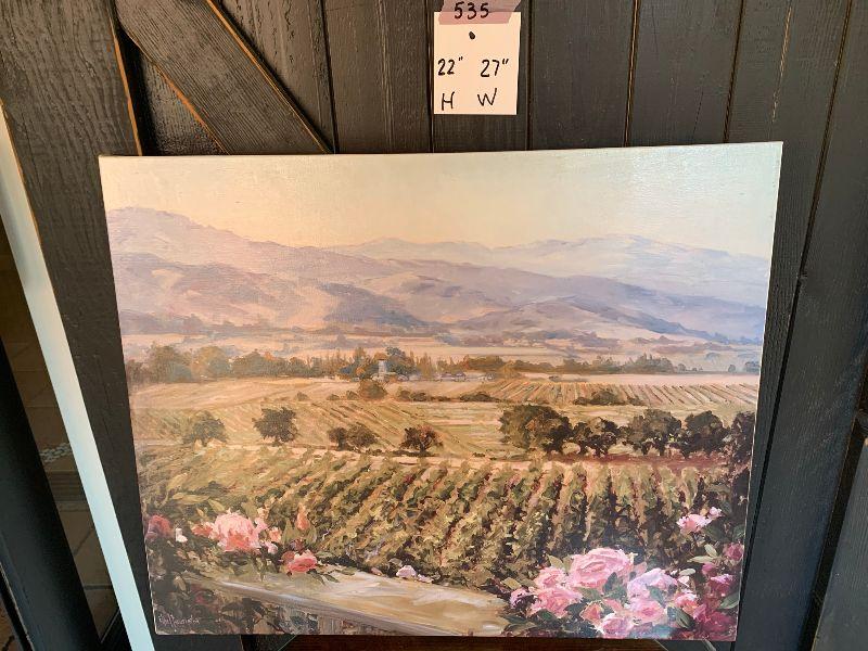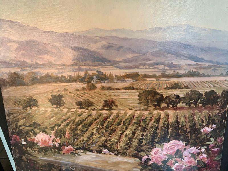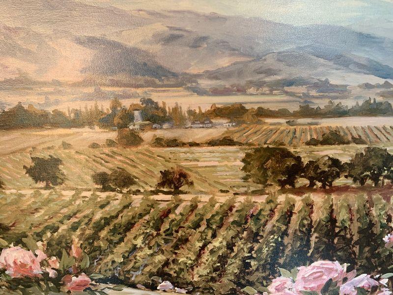 Painting on canvas, Pink Flowers and vineyard, by Ellie Freudenstein with paperwork