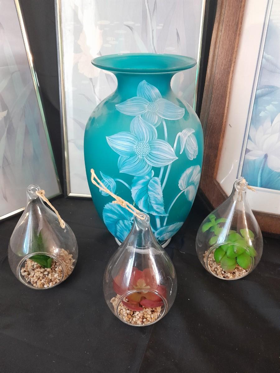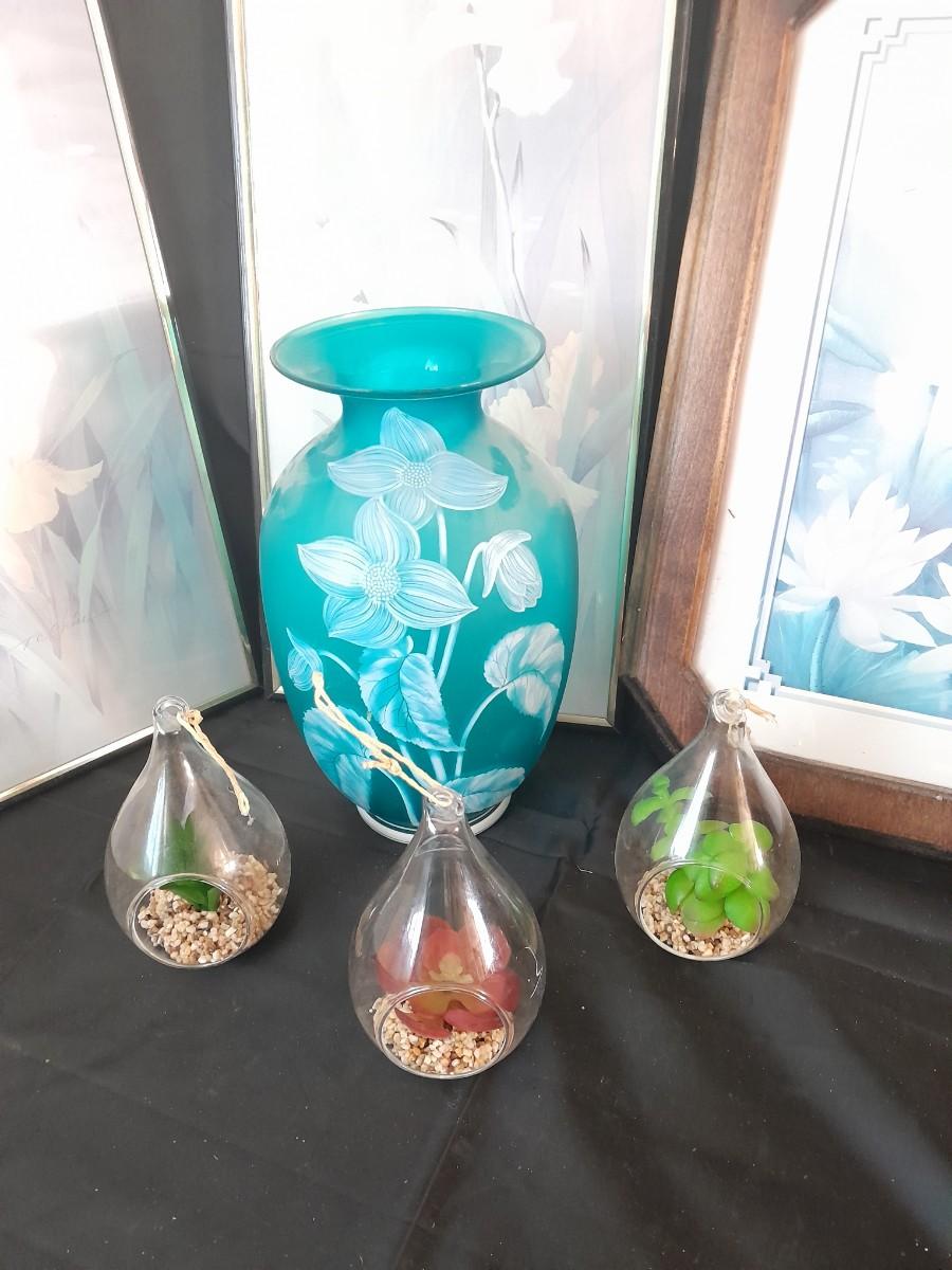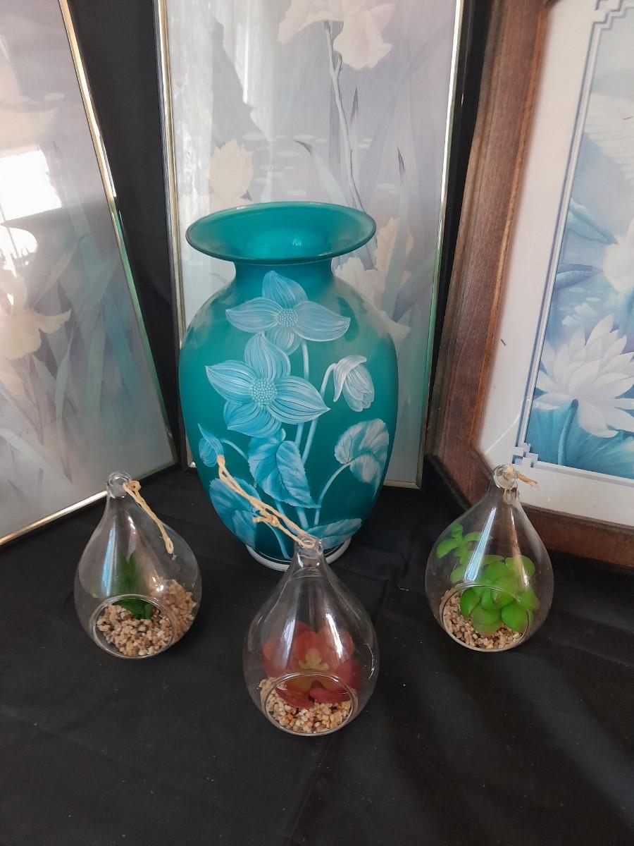 LOT 525 VASE, PICTURES, AND FAUX SUCCULANT PLANTS IN GLOBES