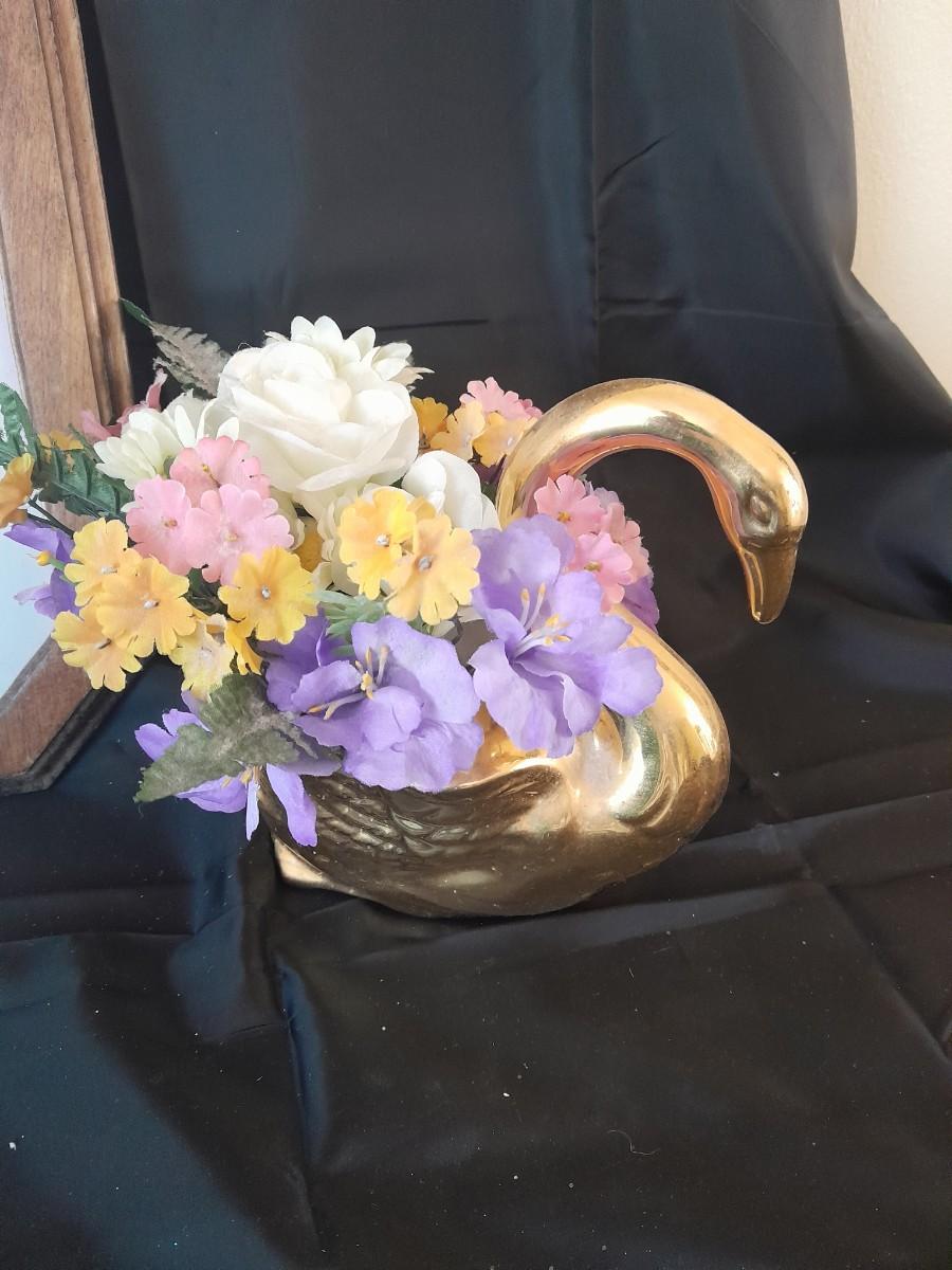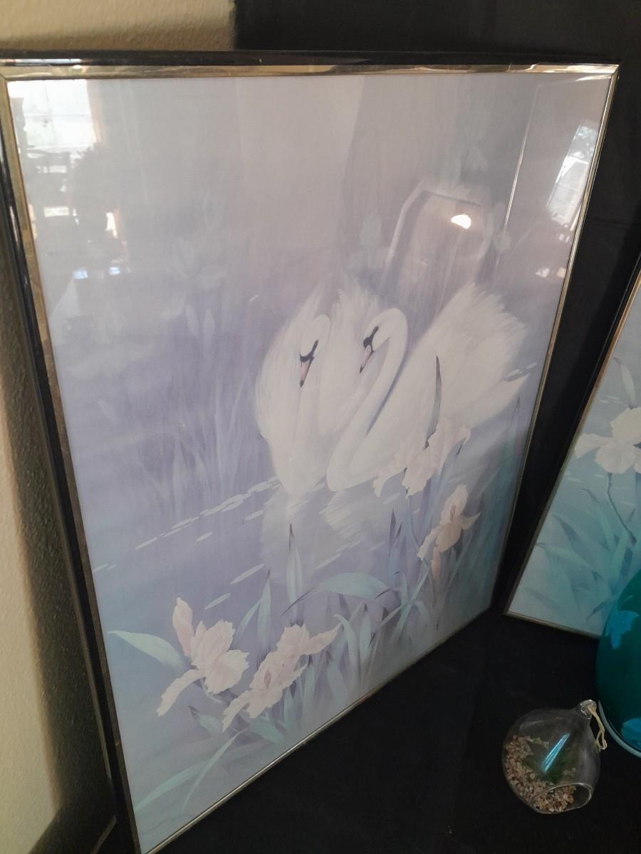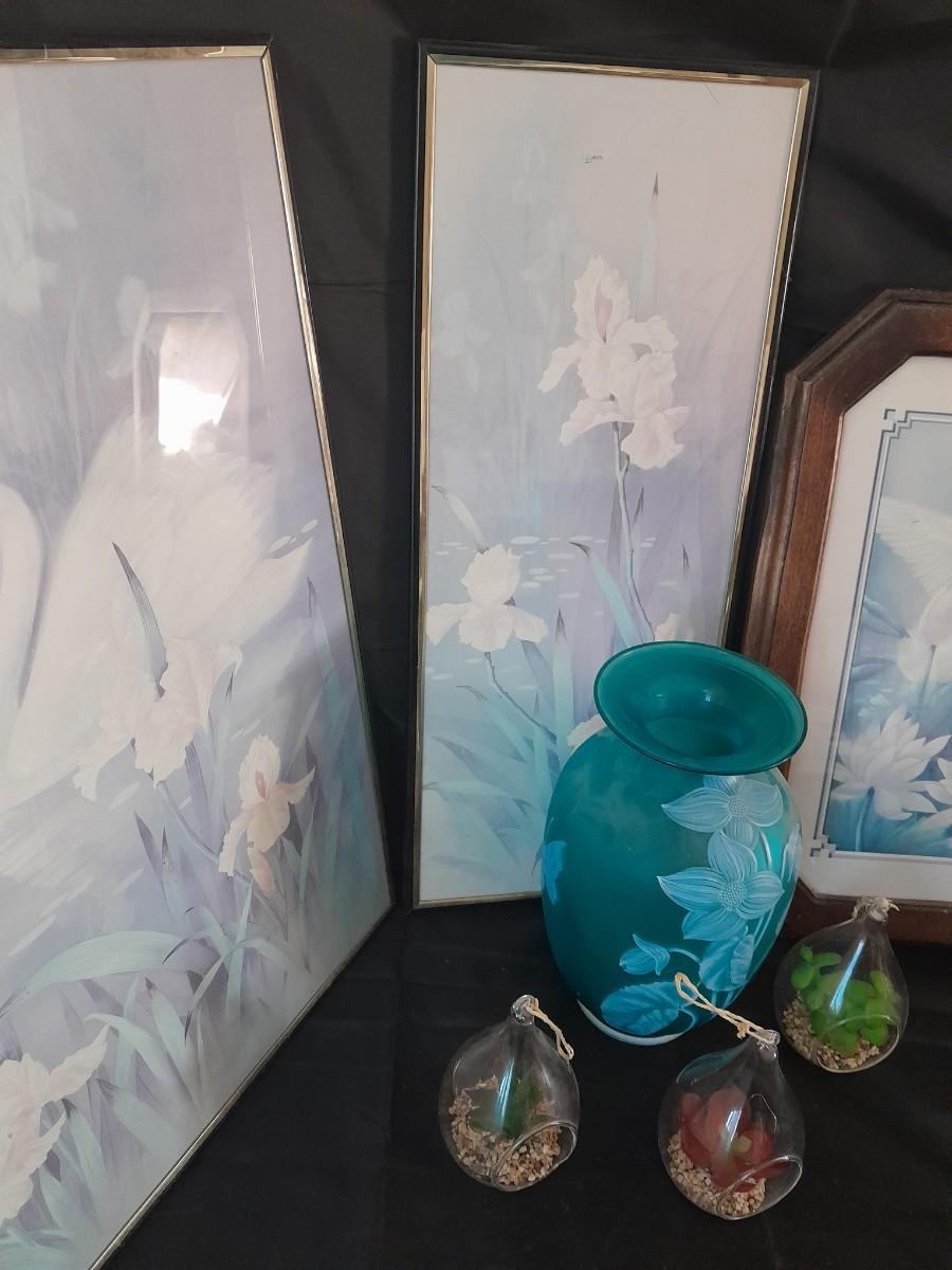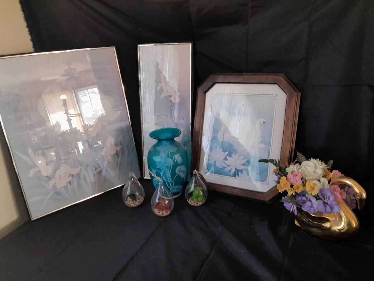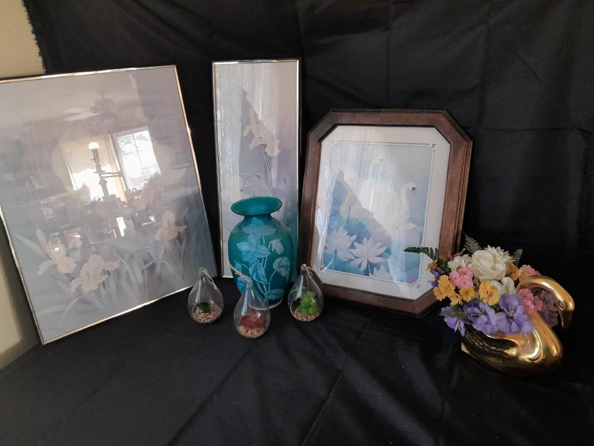 VASE, PICTURES, BRASS SWAN WITH FAUX FLOWERS, AND FAUX SUCCULANT PLANTS IN GLOBES