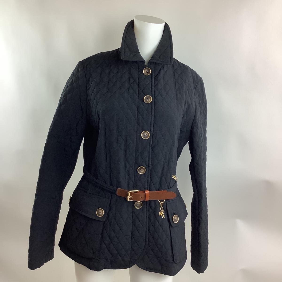 Vintage WEEKEND by Max Mara, Women’s Quilted Navy Blue Jacket with Gold Accents, Leather Closure Belt