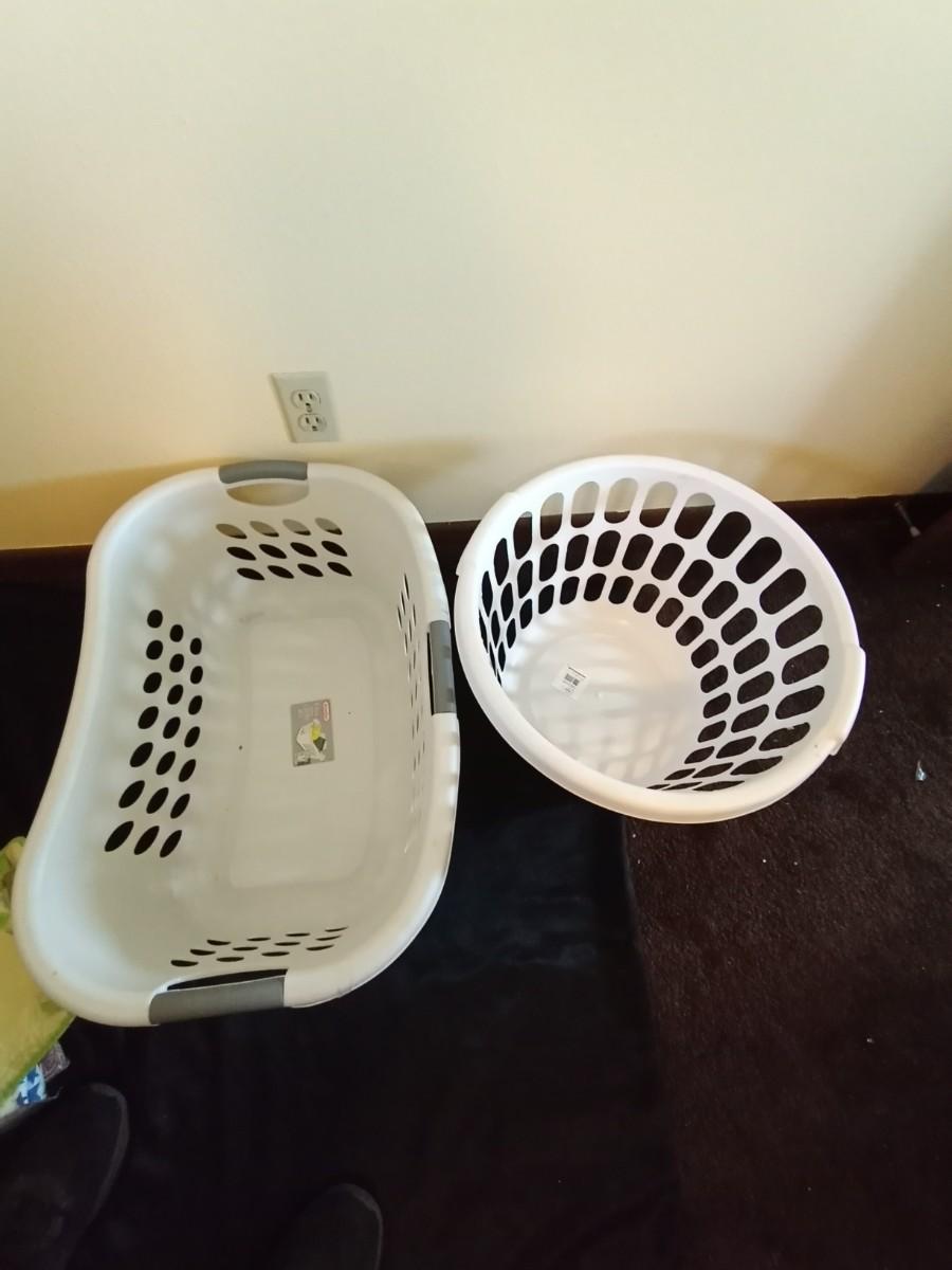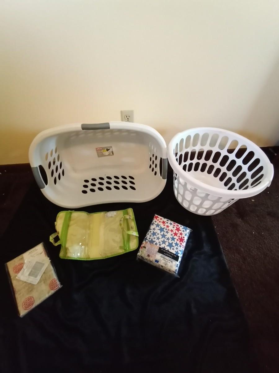 2 LAUNDRY BASKETS TABLECLOTHS AND COSMETIC BAG