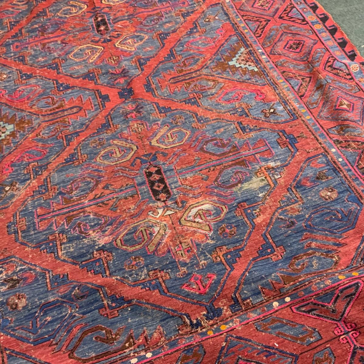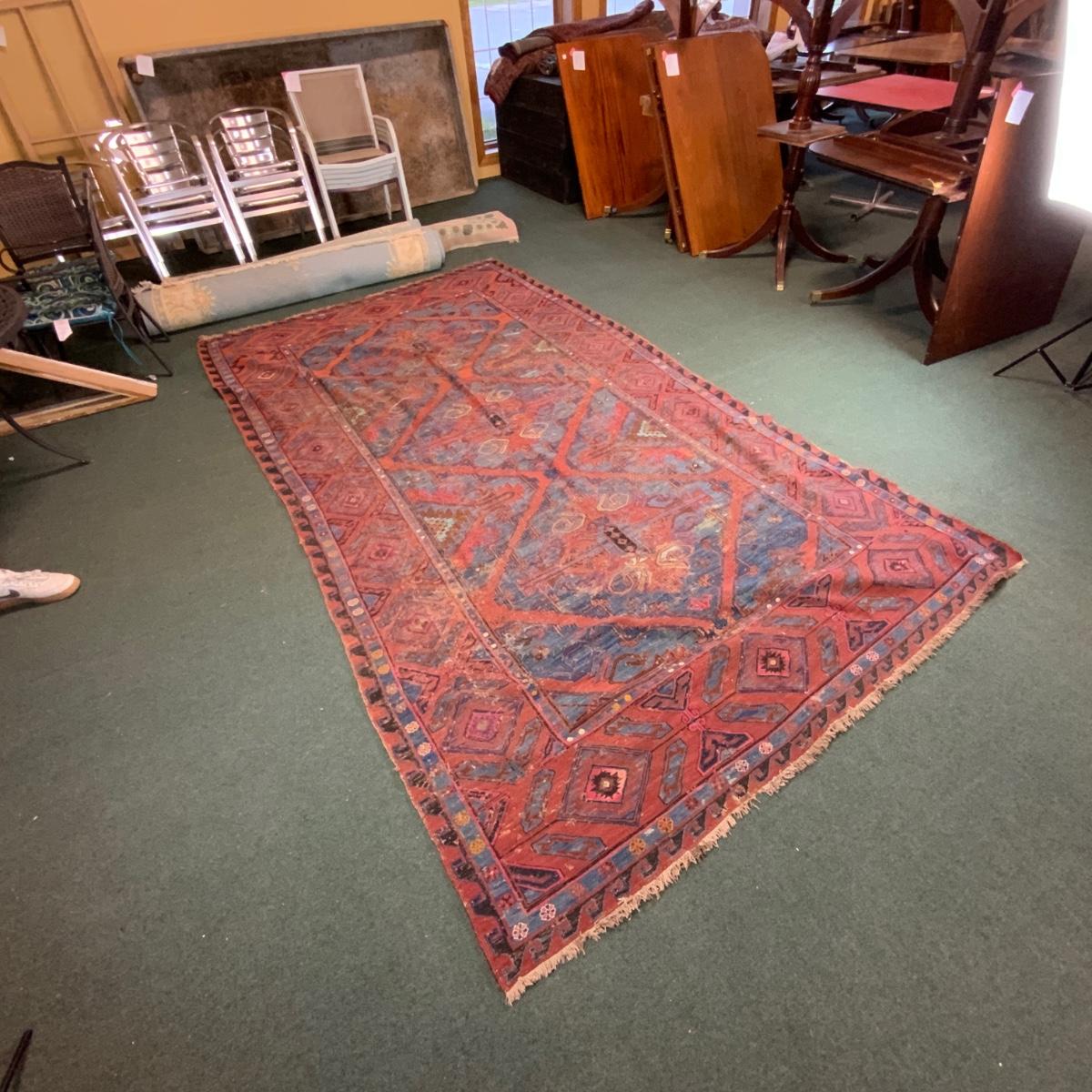 Thin Wool Rug. Beautiful color. Measures 6’ 10” x 12’ 2”. //::\\ Please see photos for details and condition. No attempt has been made to hide any imperfections. All items listed in this auction are warehouse items, and need to be cleaned. A majority of the items need restoration as well. All items are sold AS IS and WITHOUT GUARANTEE. If you are uncertain about an item, DO NOT BID. Due to the nature of this online auction in-person inspection is HIGHLY recommended. All Sales are FINAL. Pick Up Times are FIRM. Please confirm with your own schedule that you can pick up in the scheduled times listed in the Terms and Conditions. Any questions please message the auctioneer. DO NOT Contact The Harp Gallery.