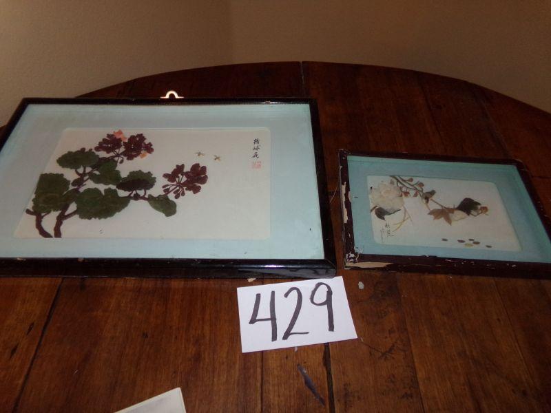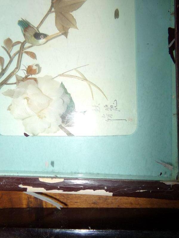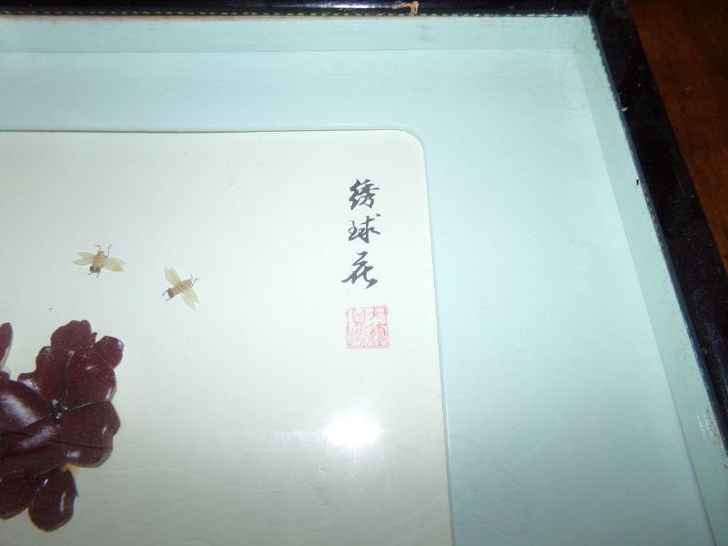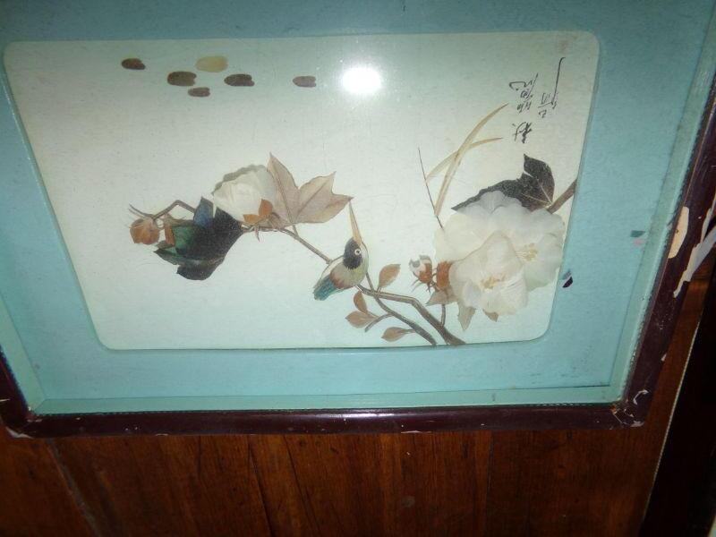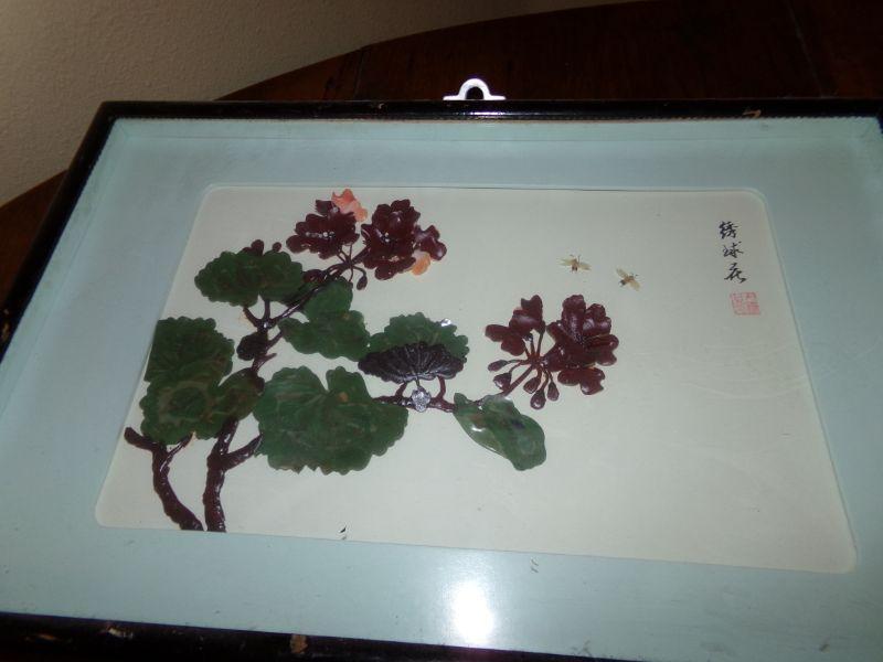 3 DIMENSIONAL ASIAN STYLE ARTWORK. THE LEAVES AND FLOWER PETALS APPEAR TO BE SOME TYPE OF ACRYLIC. FRAME IS LIKE A SHADOW BOX BOTH ARE LOSING THE PAINT ALONG THE FRONT OF FRAME