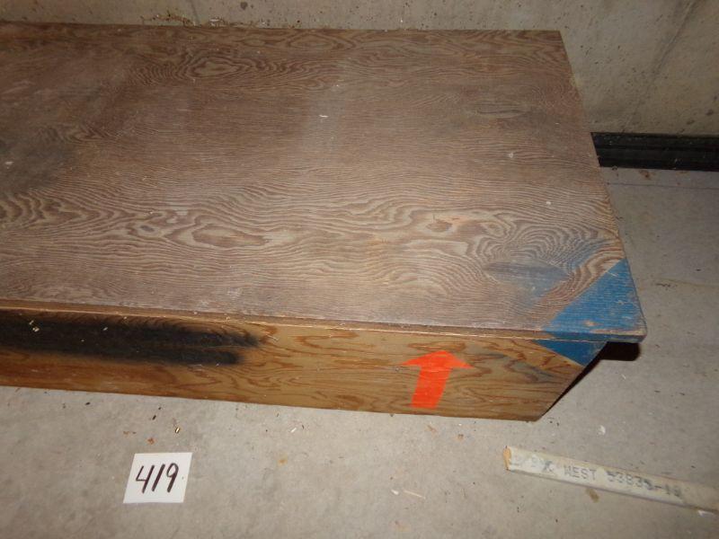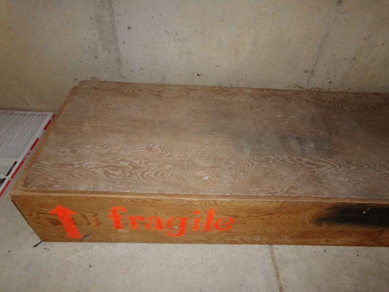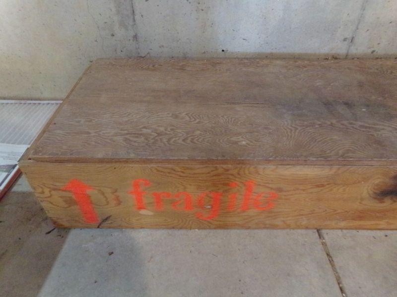WOODEN BOX CRATE THE LID IS NOT HINGED, "FRAGILE" IS PRINTED ON THE SIDE, AND DOES HAVE HANDLES ON THE SIDE.