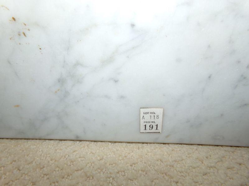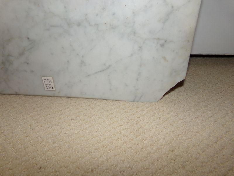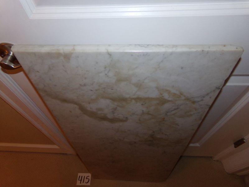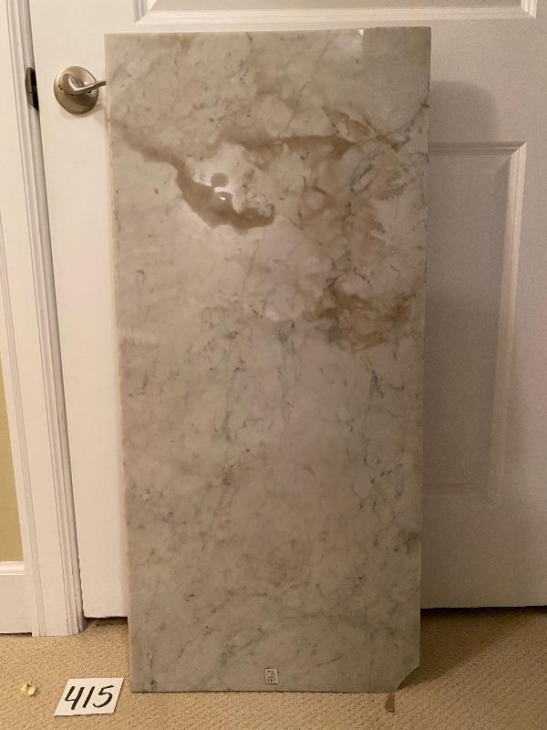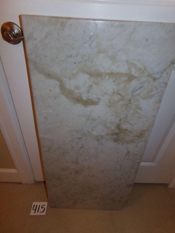 OFF WHITE WITH TAN RUNNING THROUGH THIS PIECE OF MARBLE. 1 CORNER IN BROKEN OFF. MEASURES 39” x 18” AND 3/4” THICK.