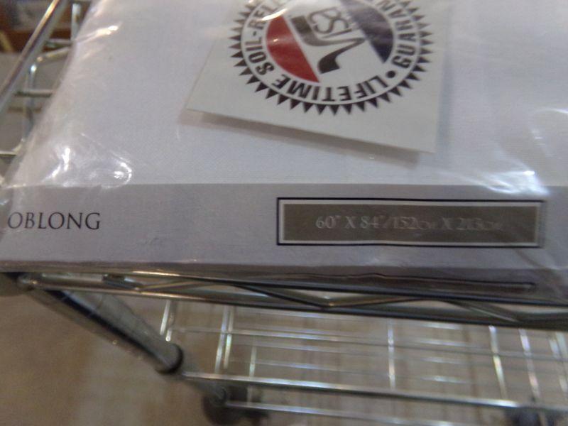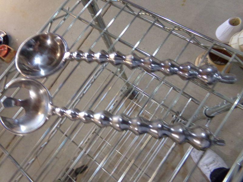 STURDY KITCHEN CART ON CASTERS, TABLE CLOTH (60X84) & SALAD UTENSILS.