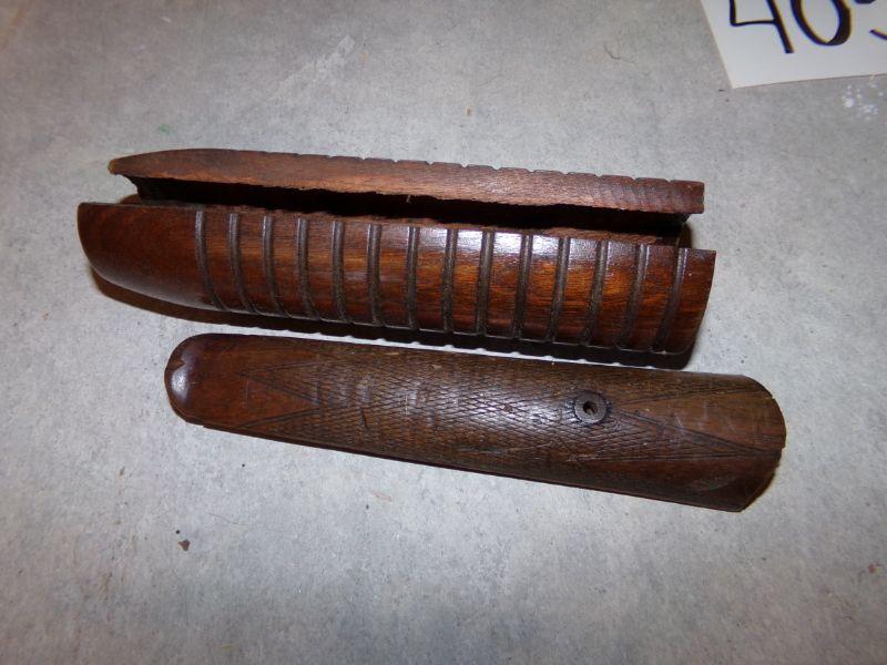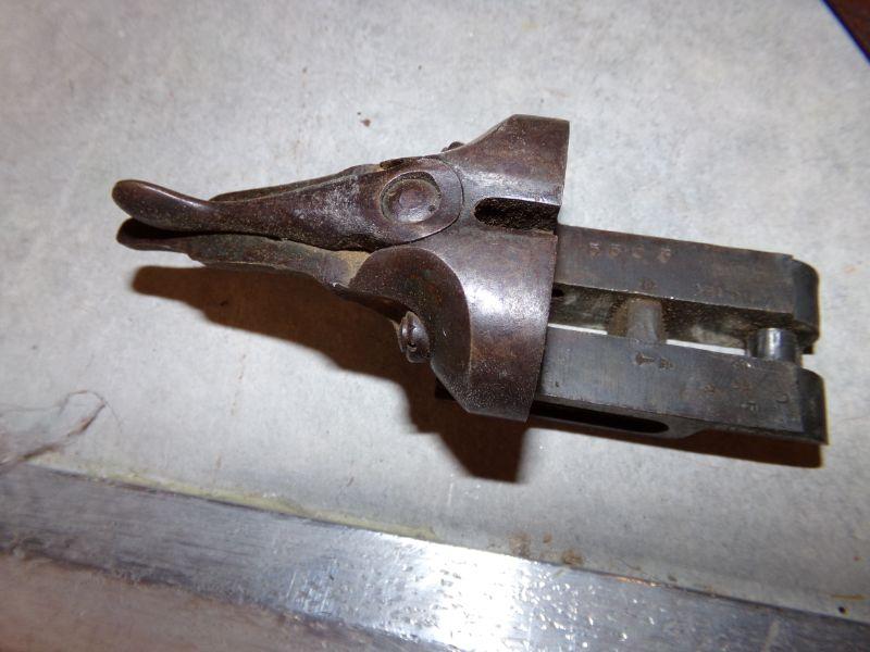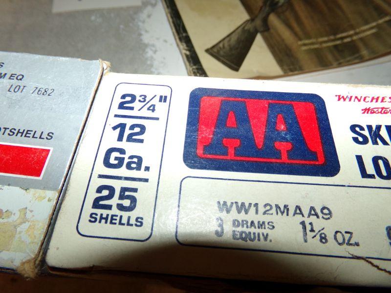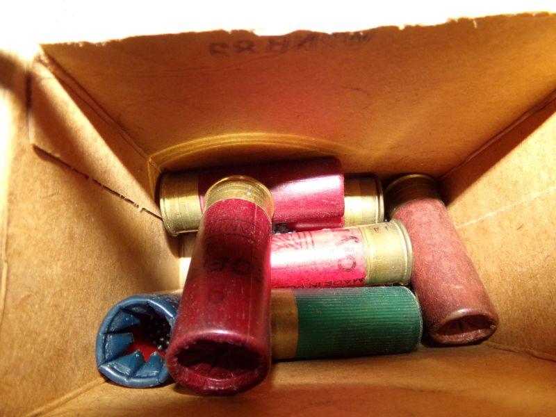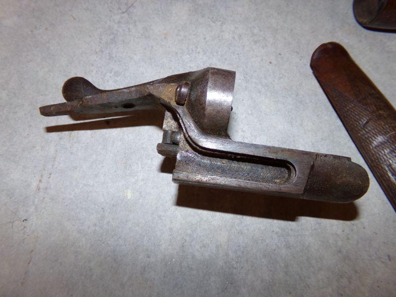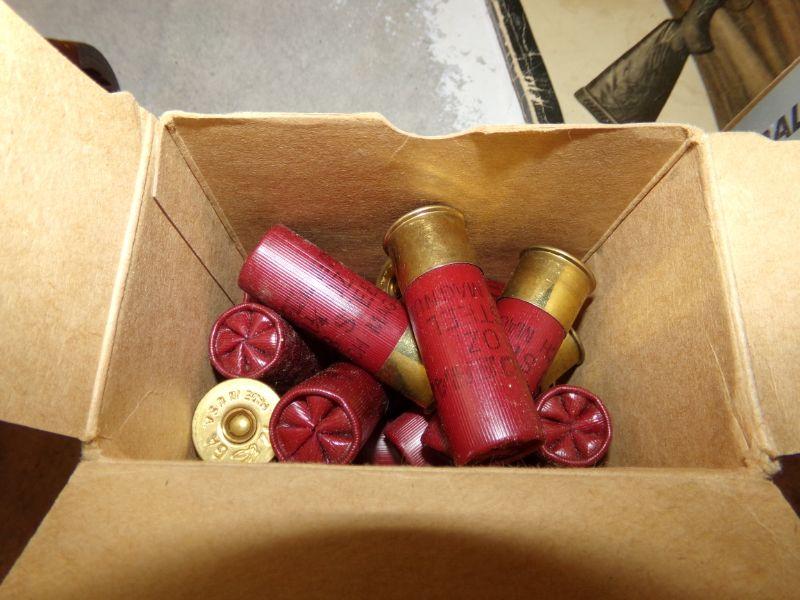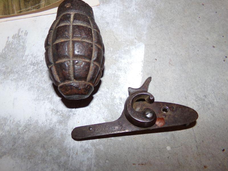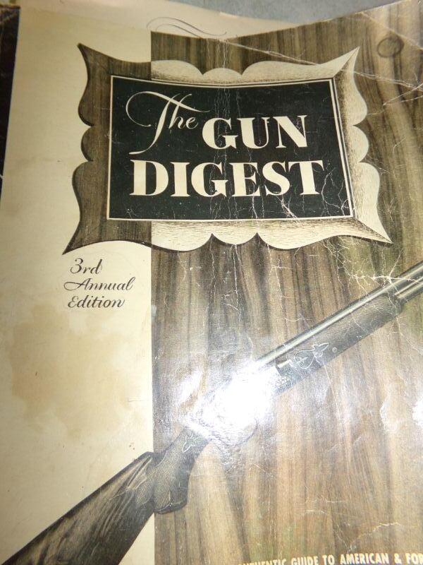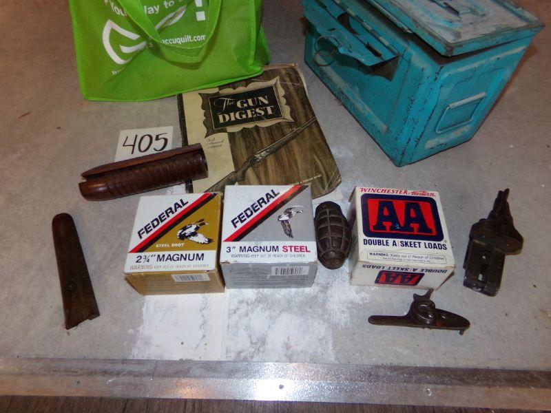 GUN DIGEST MANUAL, 2-FEDERAL SHOTGUN SHELLS (2.3/4 & 3") UNARMED HAND GRENADE, DOUBLE A SKEET LOAD, AMMO BOX, WOODEN STOCK, DOUBLE BARREL SHOTGUN ASSEMBLY & ANTIQUE BLACK POWDER TRIGGER