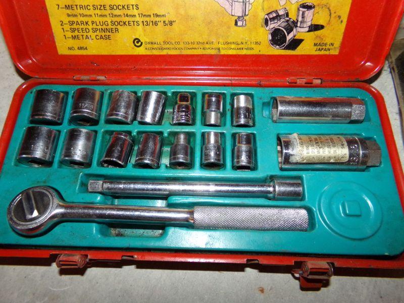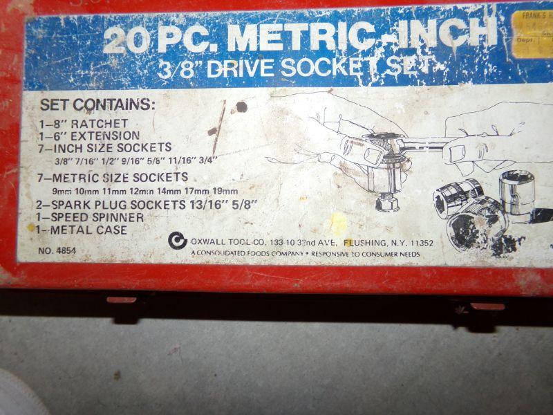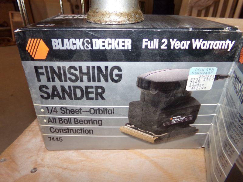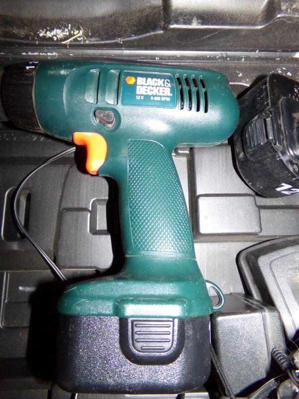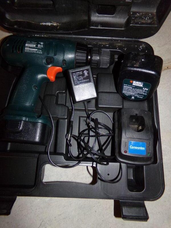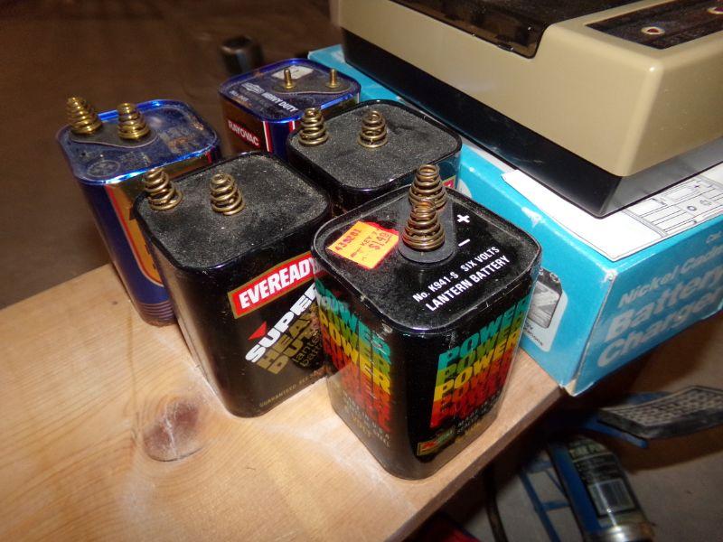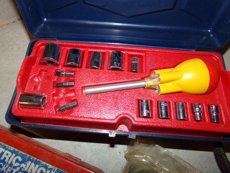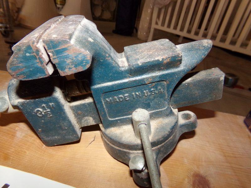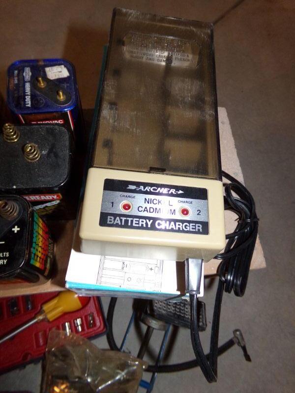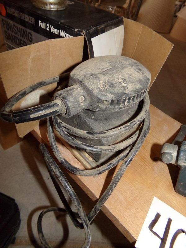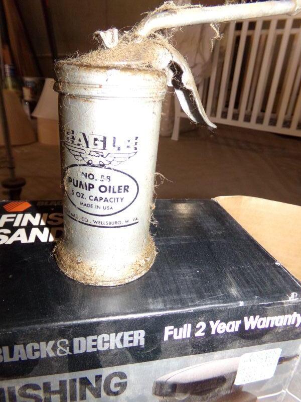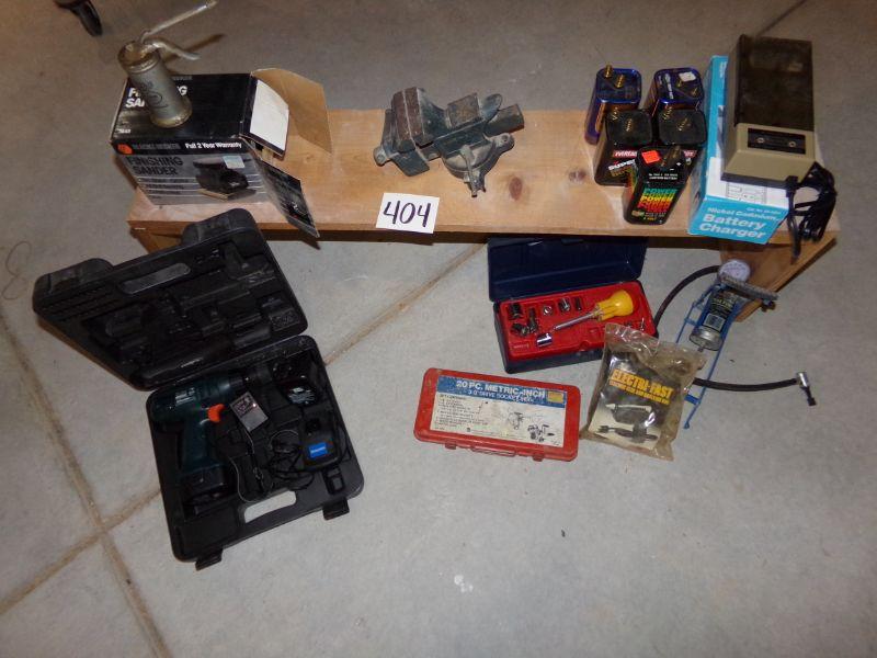 ANTIQUE OIL CAN, FINISHING SANDER, BENCH VISE, 6 VOLT BATTERIES, BATTERY CHARGER, AIR PUMP, SOCKET SET, BLACK & DECKER DRILL