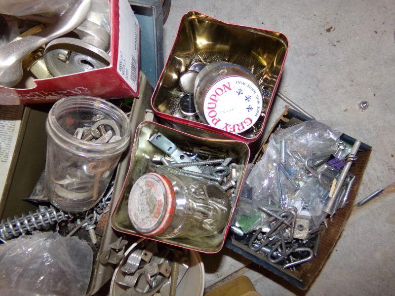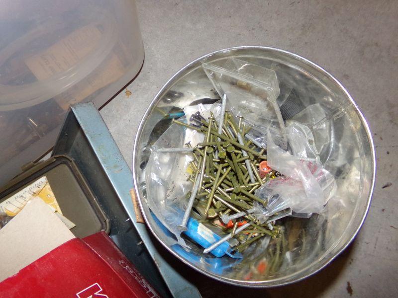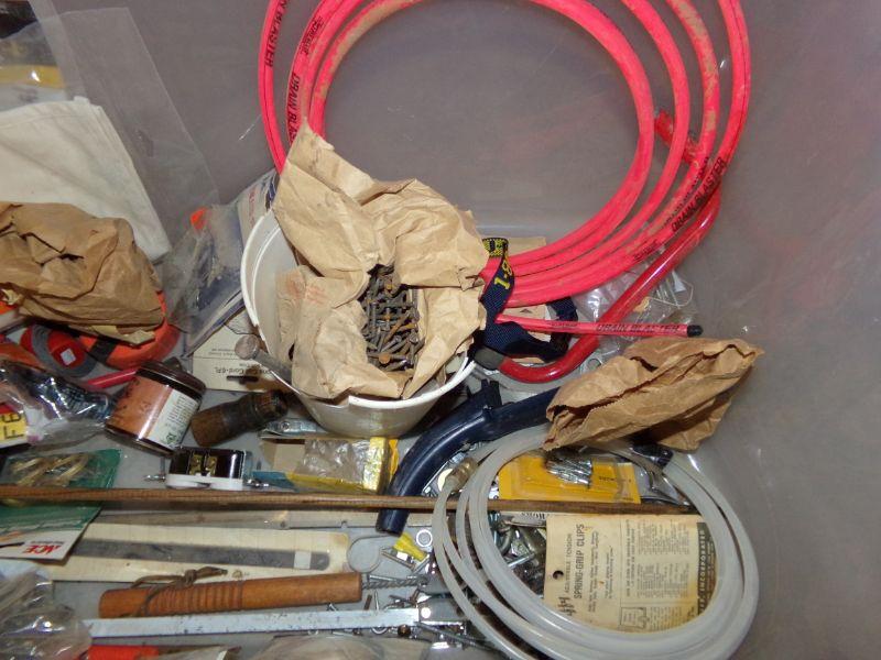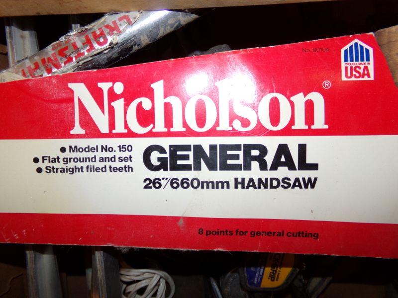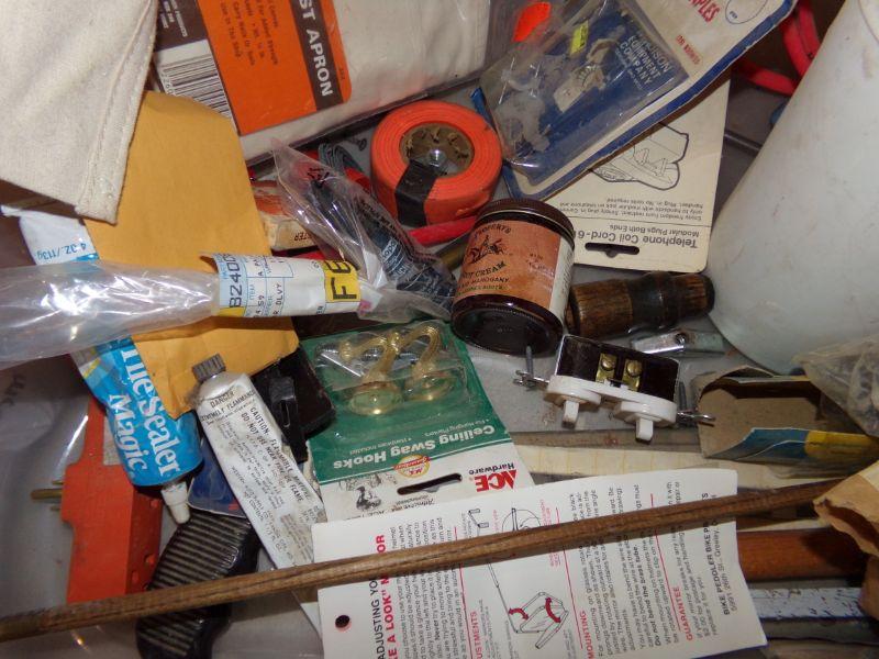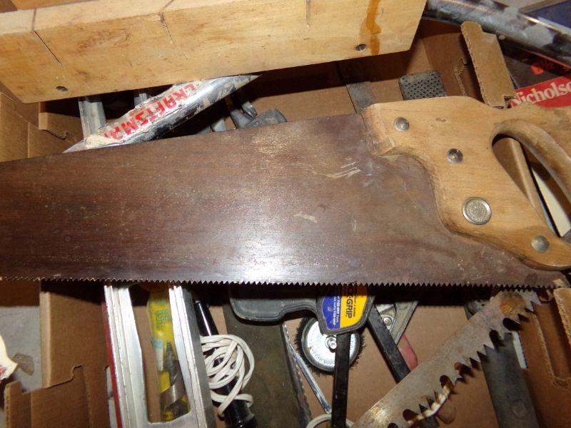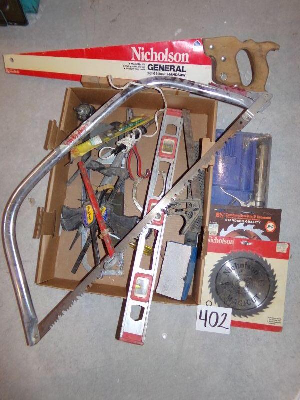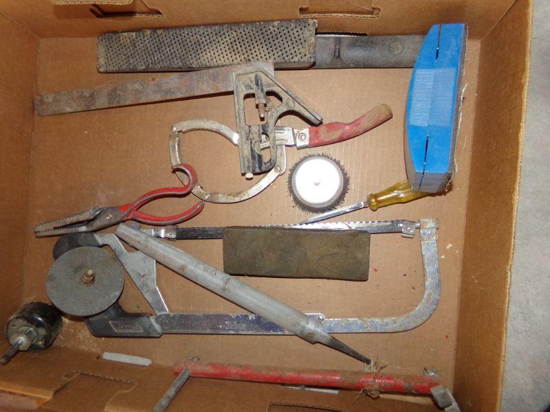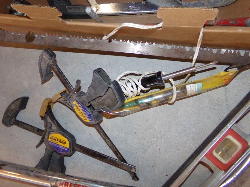 LEVEL, HACK SAW, SQUARE, SANDING BLOCK, REG & WOOD FILE, SOLDERING IRON, QUICK GRIP CLAMPS, WOOD DRILL BIT, SAW, WIRE BRUSH, CIRCULAR SAW BLADES, GREASE GUN, BORING DRILL BIT, PLIERS, CLAMP & GRINDING STONE