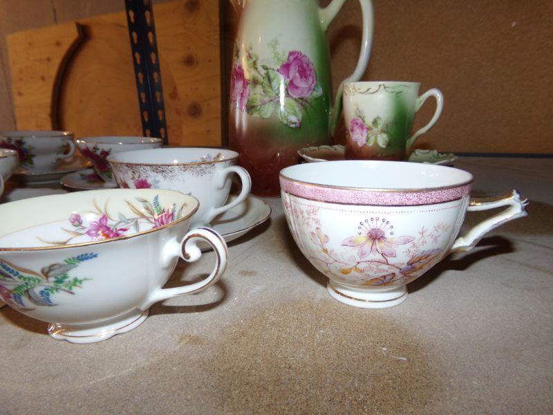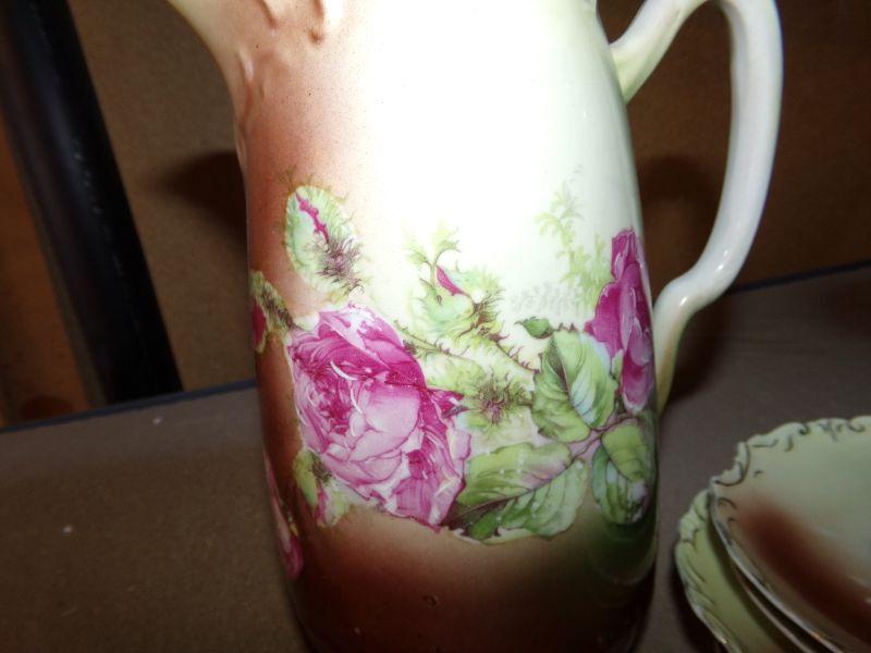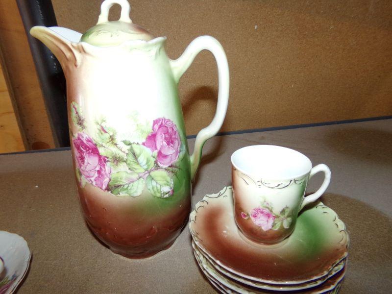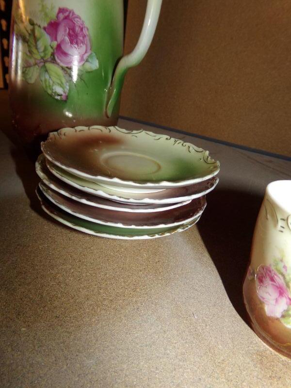 HAND PAINTED COFFEE OR TEAPOT WITH MATCHING SAUCERS AND 1 CUP
