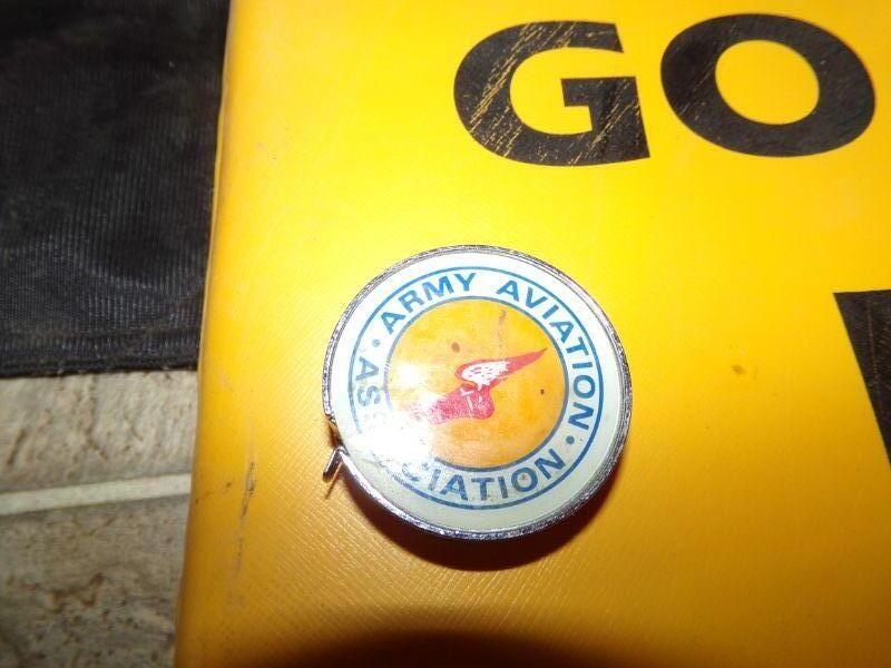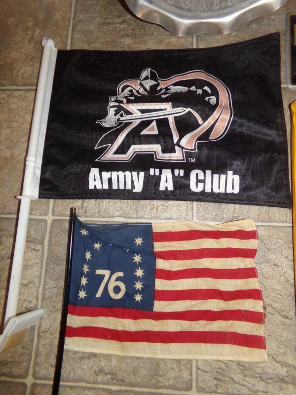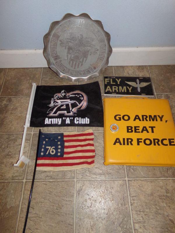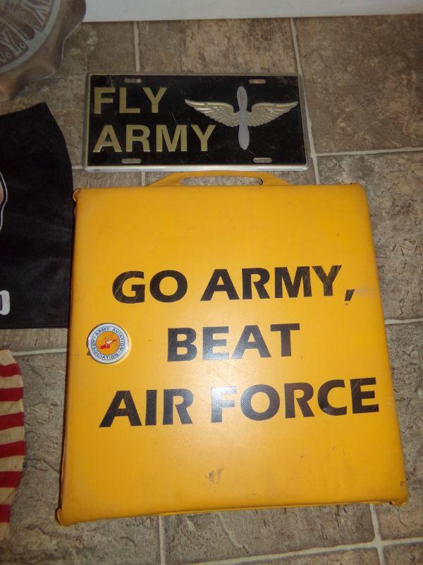 SEAT CUDHION, CAR AND CENTENNIAL US FLAGS, ARMY AVIATION ASSOCIATION TAPE MEASURE, "FLY ARMY" SIGN AND ARMY RELATED METAL PLATTER/SIGN