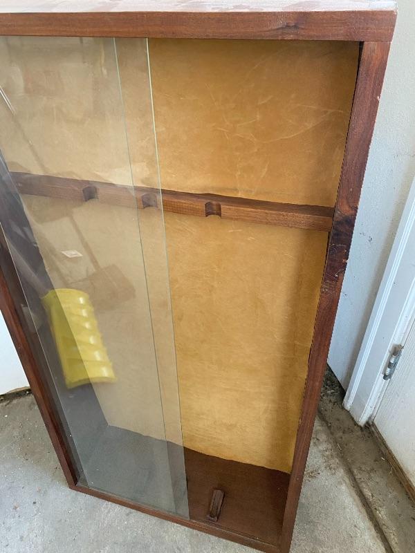 GUN CASE HAS GLASS FRONT WITH WOOD FRAME, HOLDS 3-4 GUNS, CASE DOES NOT LOCK. BOTH ARE IN GOOD CONDITION.