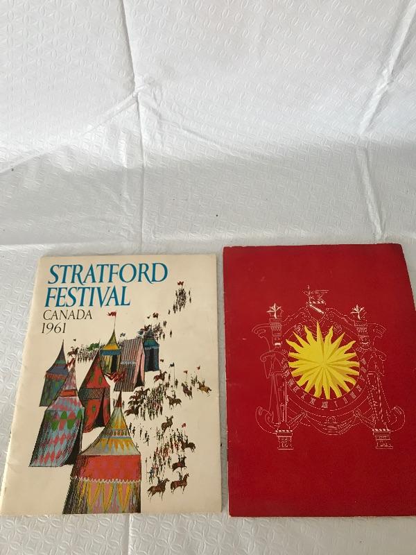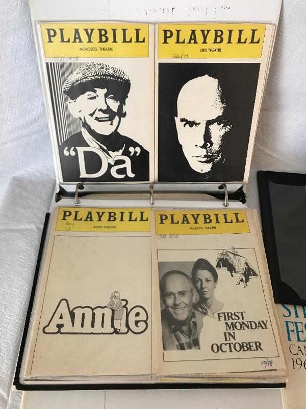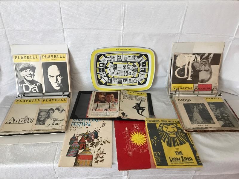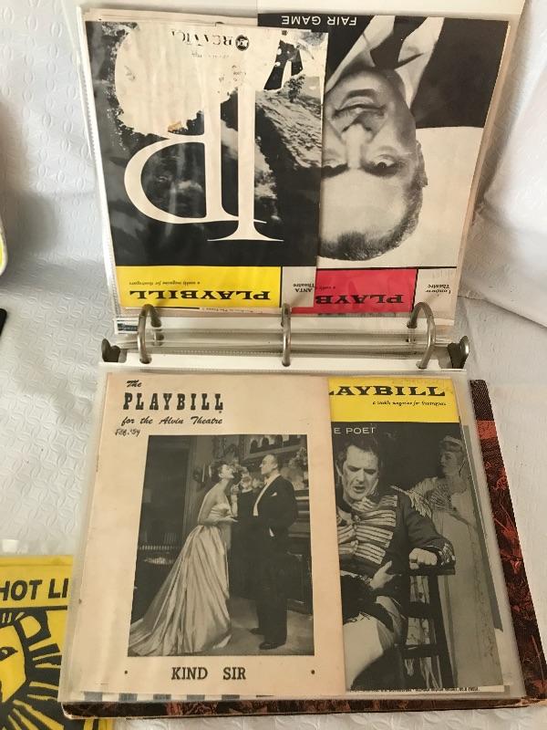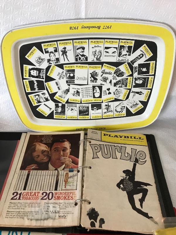 3 three ring binders of vintage playbills, vintage Sanka coffee tin Tray 1977-1978 Broadway showing schedule is printed on back with pictures of playbills on front, vintage vinyl poncho “three hot shows. One hot line” one size fits all