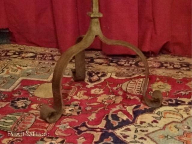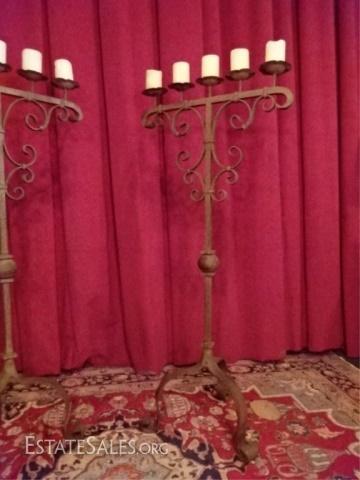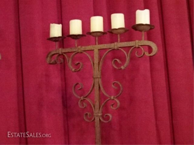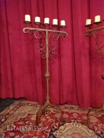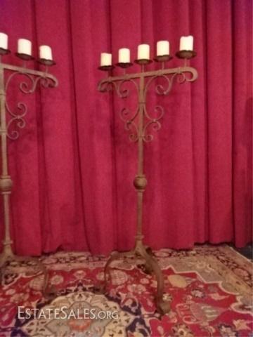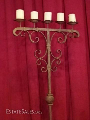 LOT 53B: PAIR 5 LIGHT IRON FLOOR CANDELABRA, SCROLLING METAL BASE, VERY GOOD CONDITION WITH OXIDIZED FINISH FROM PATIO USE OUTDOORS, EACH APPROX 6'H, SKU351
