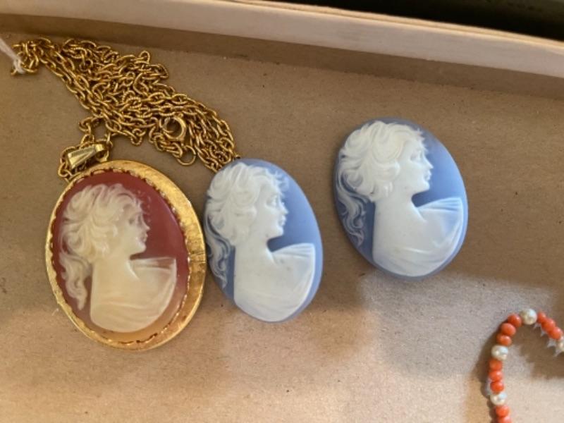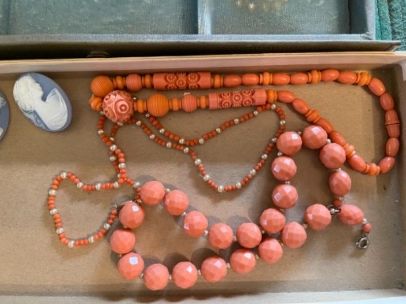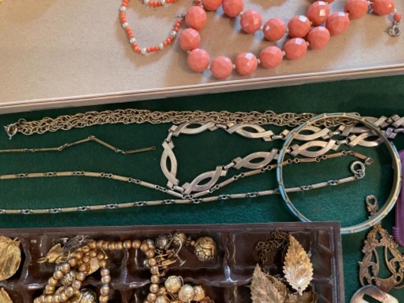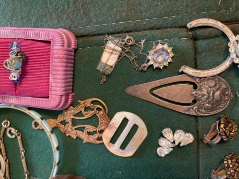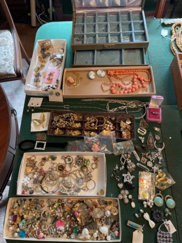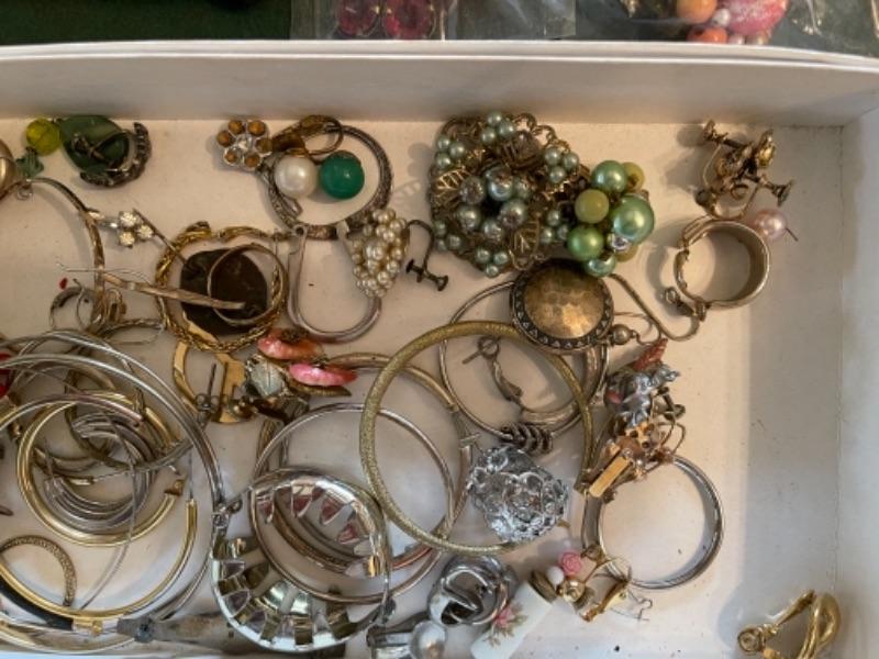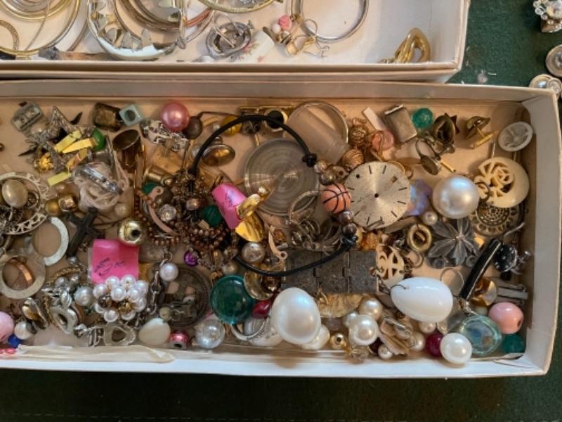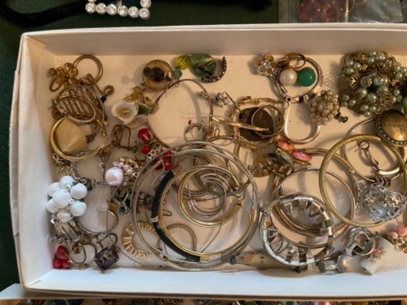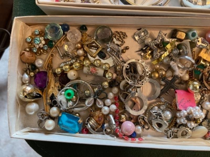 Lot 53DR. Vintage costume jewelry odds and ends, jewelry box, etc.--$45