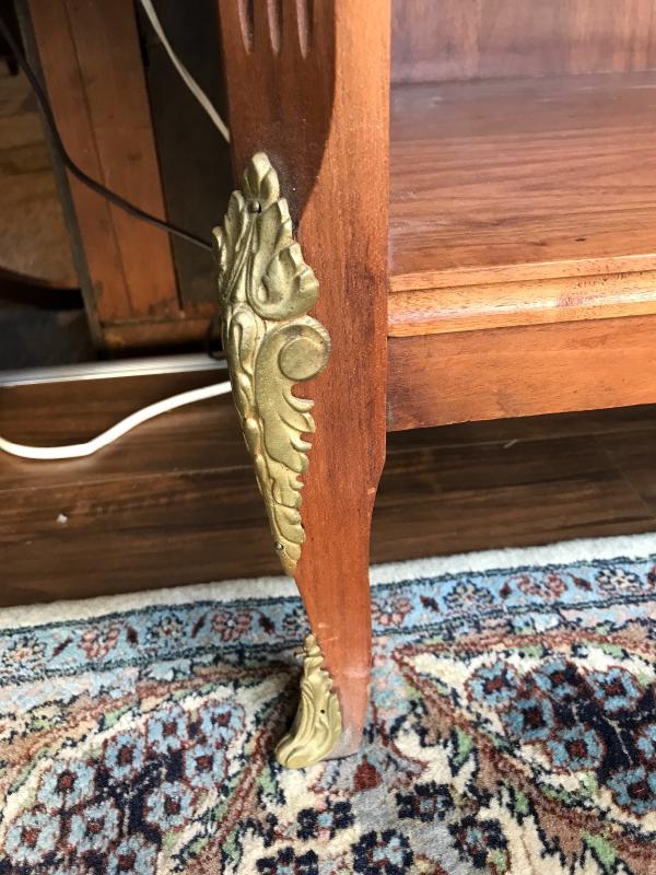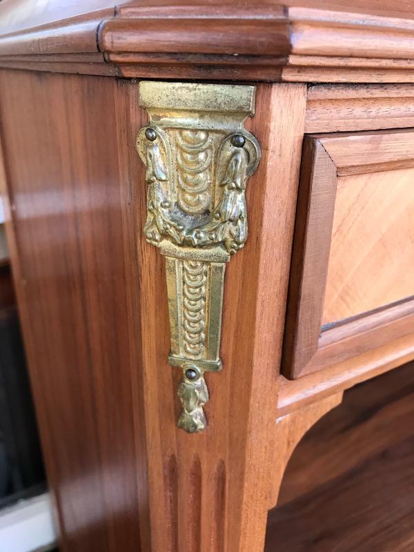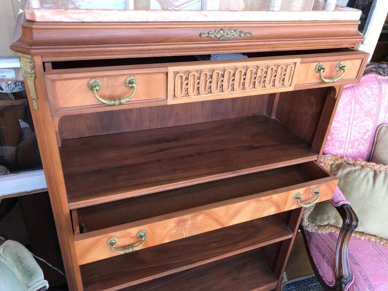 Very nice Louis VXI style bookcase in ormolu mounted mahogany with pink marble top. Two drawers and three shelves. Great condition. 12" x 32" x 49" H