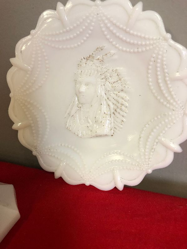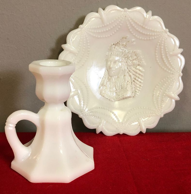 Lot 54 2 Milk Glass Candle Stick and plate with Native American