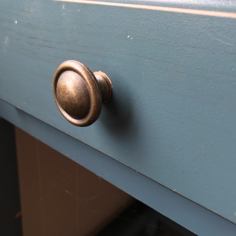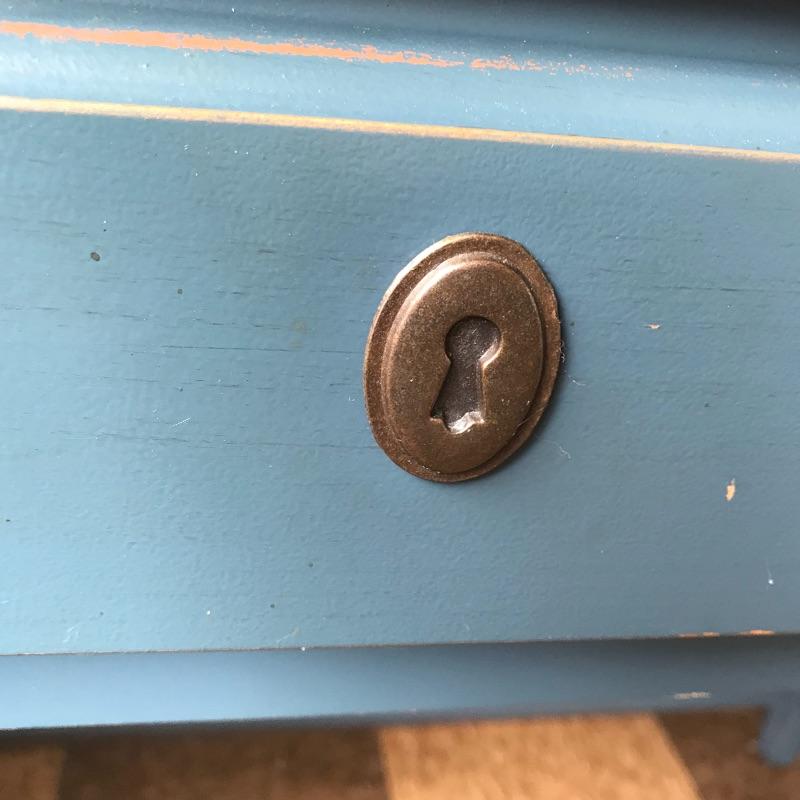 Cute wooden computer desk with blue chair. The desk has an antique feel with a faux lock and purposed wear. Desk measures approximately 45” x 22” x 30.5” and has a multi-function drawer that can also be used as a keyboard tray. Desk is accompanied by a slightly more gray/blue chair. Chair is sturdy and in nice shape with some wear noted in photos. See photos. Local pick up only.