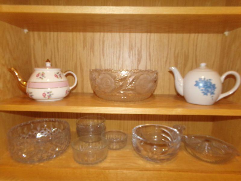 2 TEAPOTS, 2 CRYSTAL SERVING BOWLS AND MORE