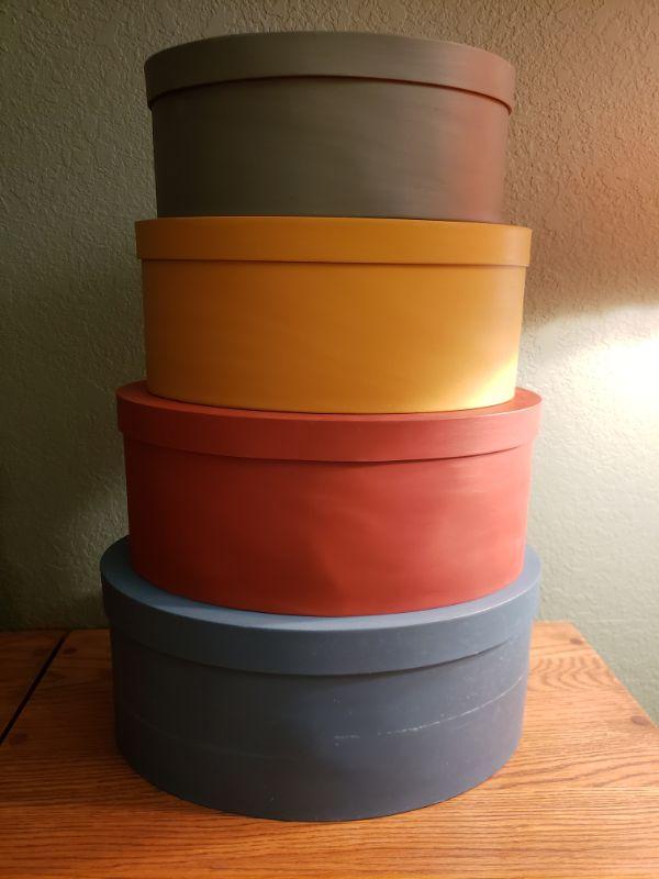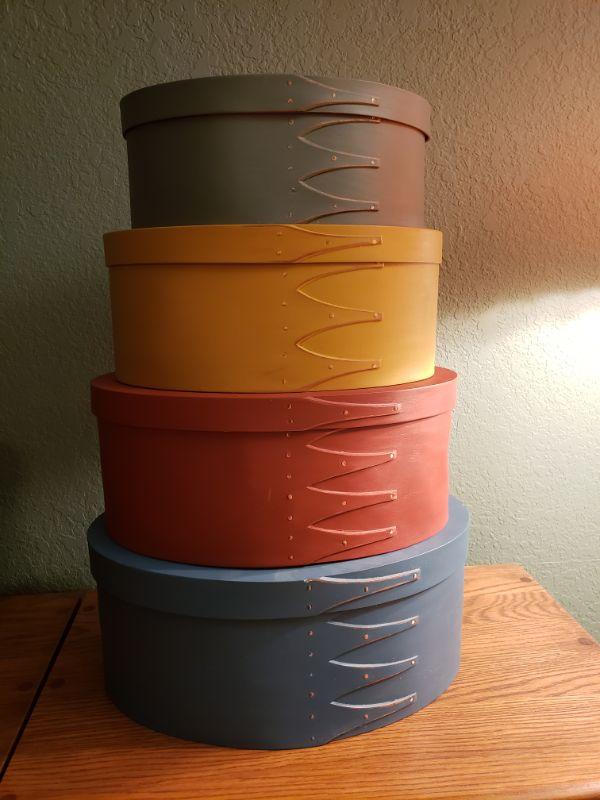 Colorful Shaker Nesting Box Set. Small to large: 10"x7"x4" ... 11"x8"x4.75" ... 12.5"x9.25"x5.25" ... 13.25"x10.25"x5.75"