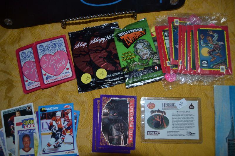 Several unopened packs of trading cards. I Love Lucy, Sleepy Hallow. (Hollywood Zombies removed). Hockey cards, some football. Adams Family.