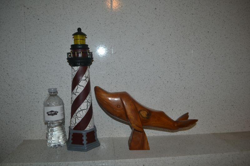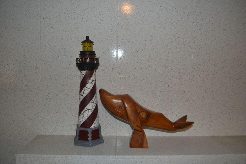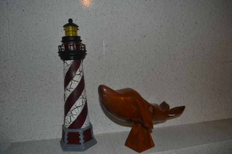 CARVED WHALE AND DECORATIVE LIGHT HOUSE
