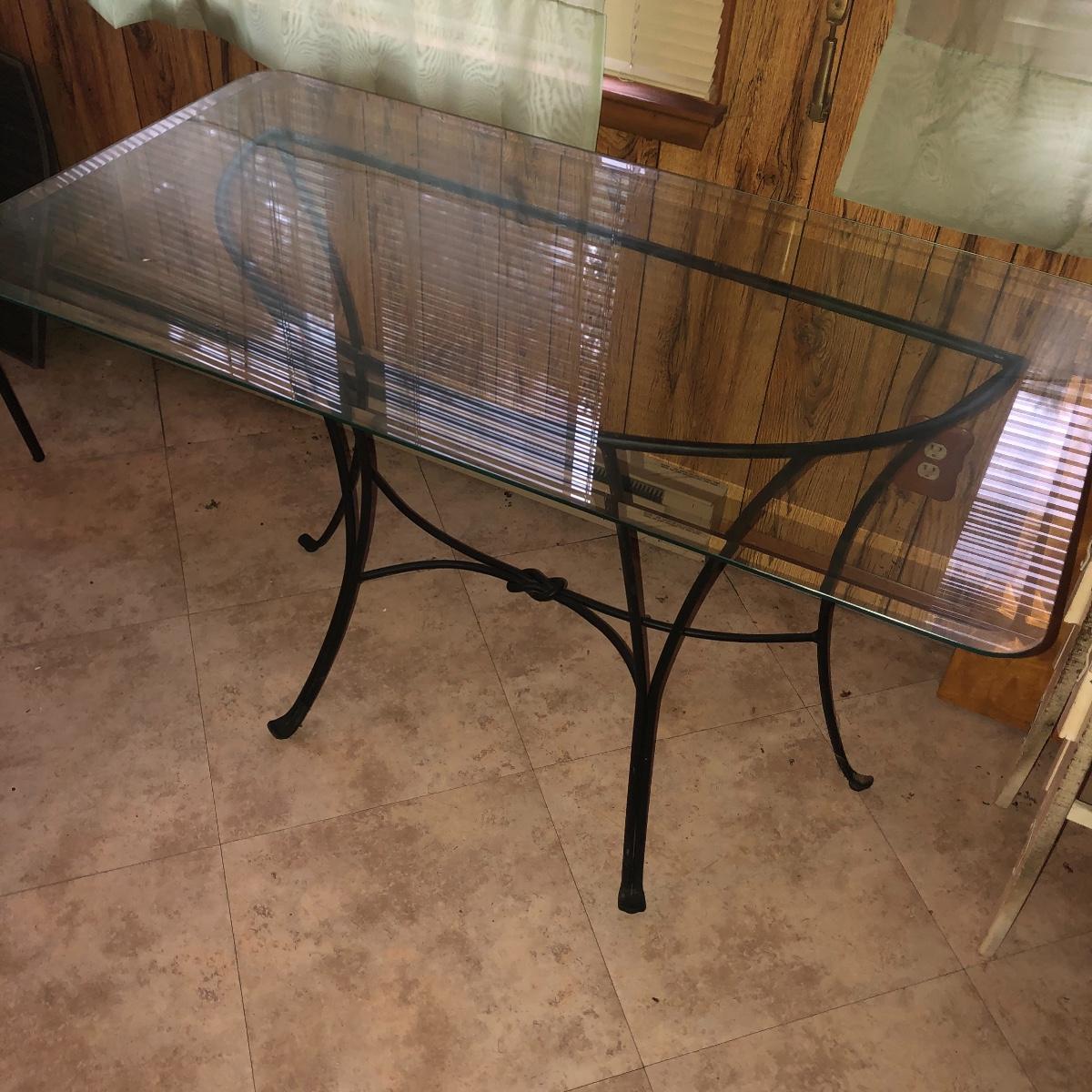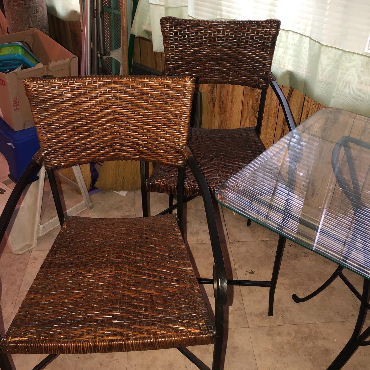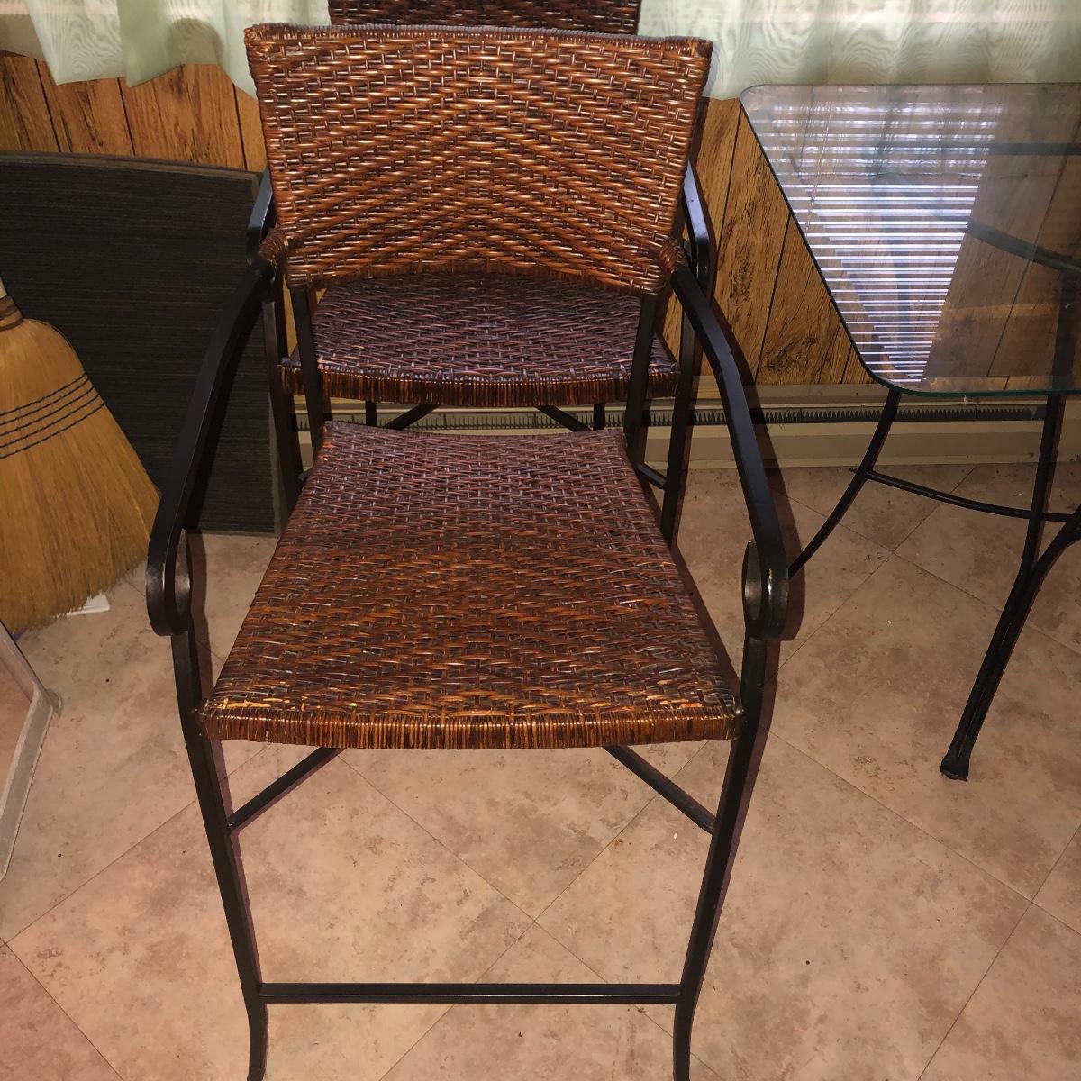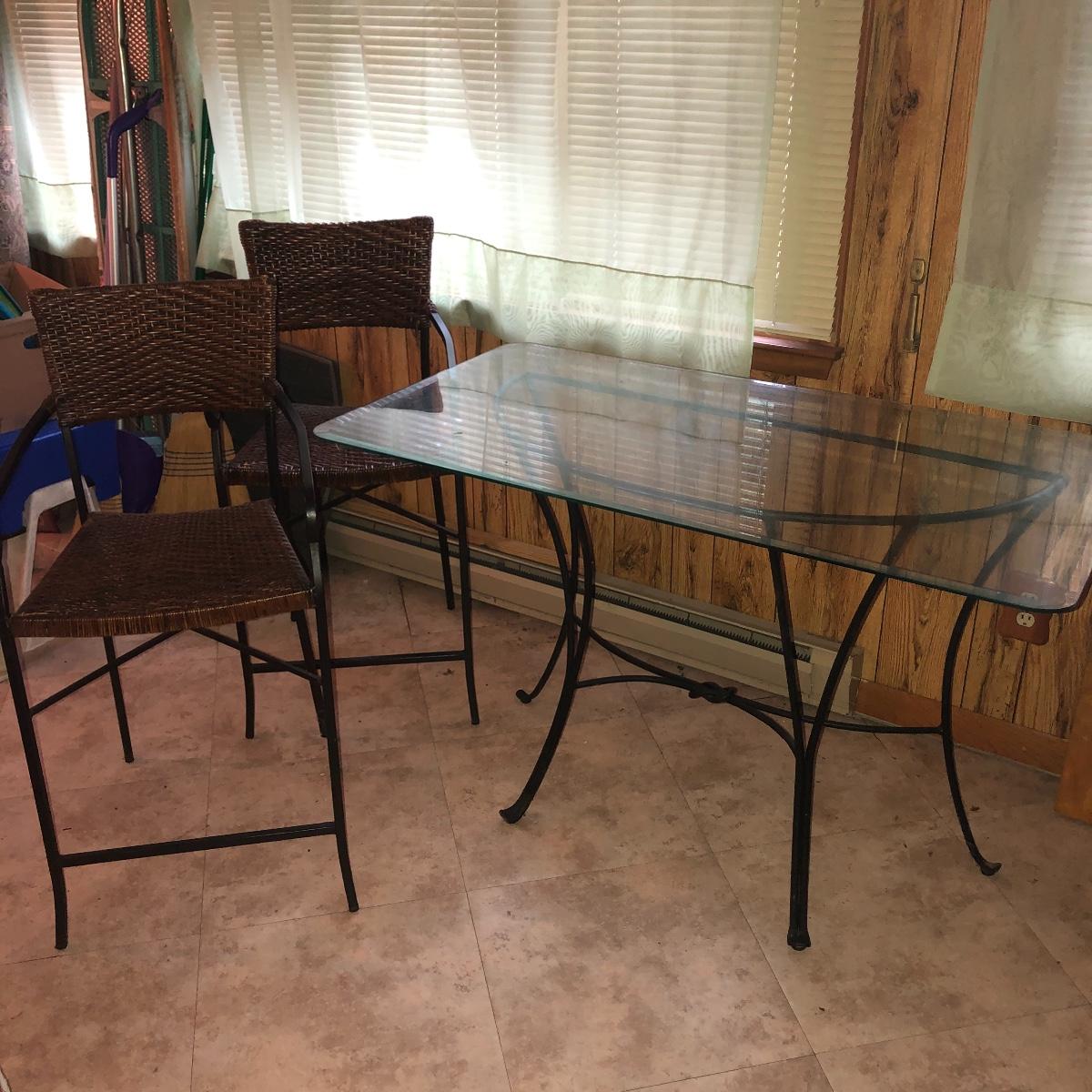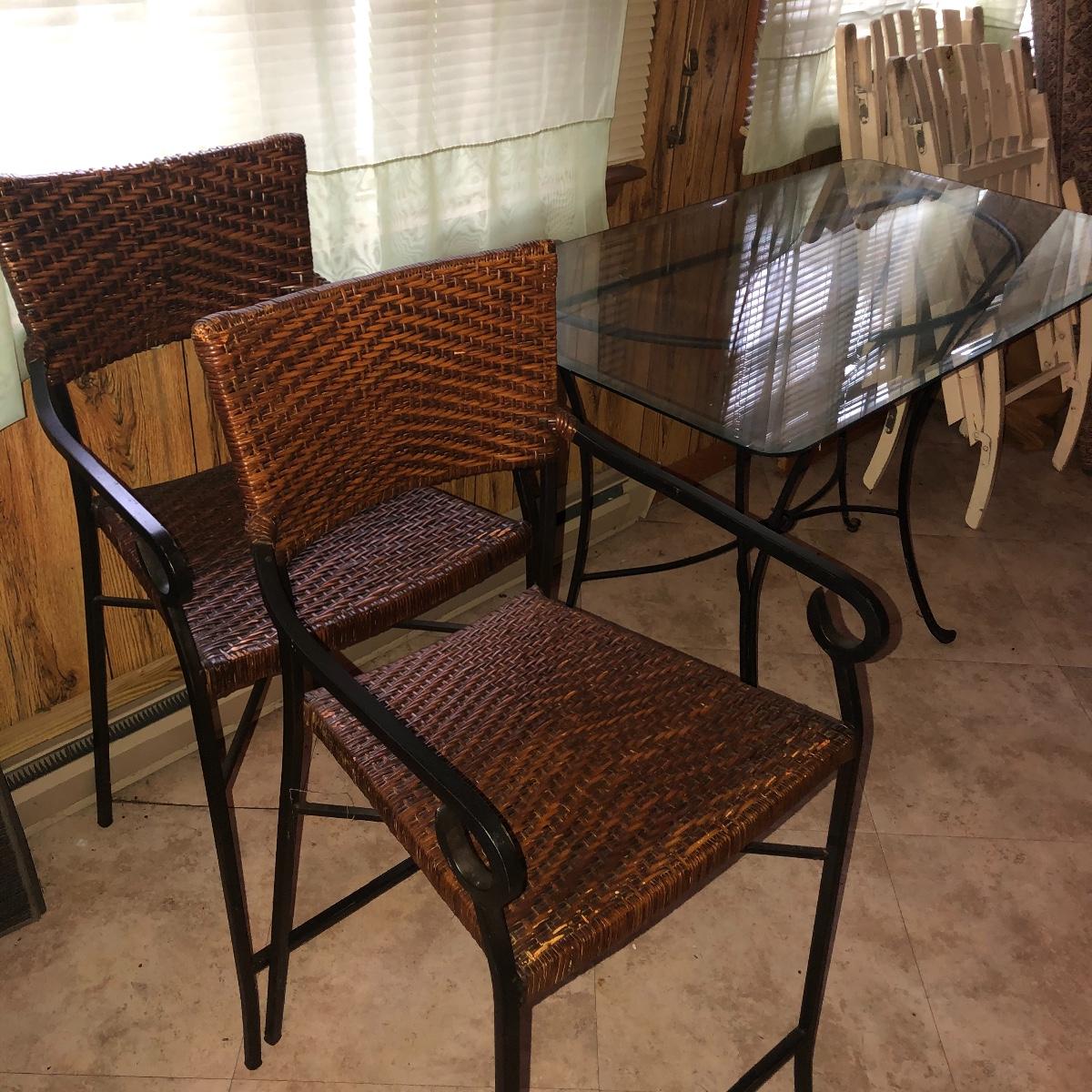 Metal based table with a removable glass top. The glass is 48” x 26” with the tabletop height at 30.25”. Both stool chairs have woven seats and backs with iron frames. These measure approximately 19” x 18” x 38.5” with a seat height at 24”.