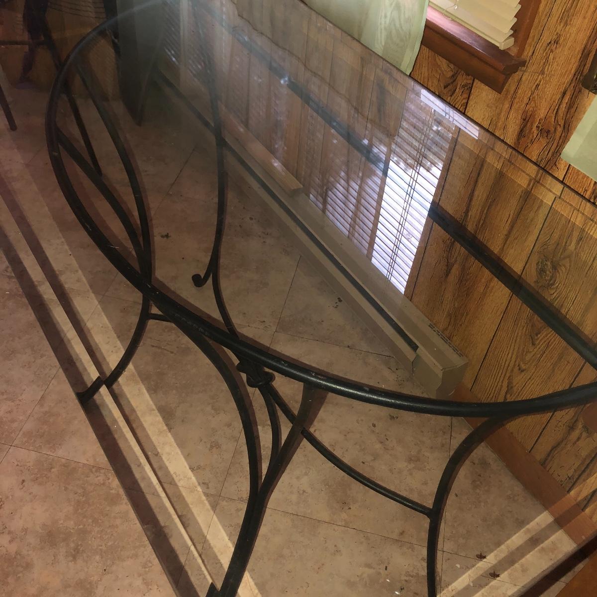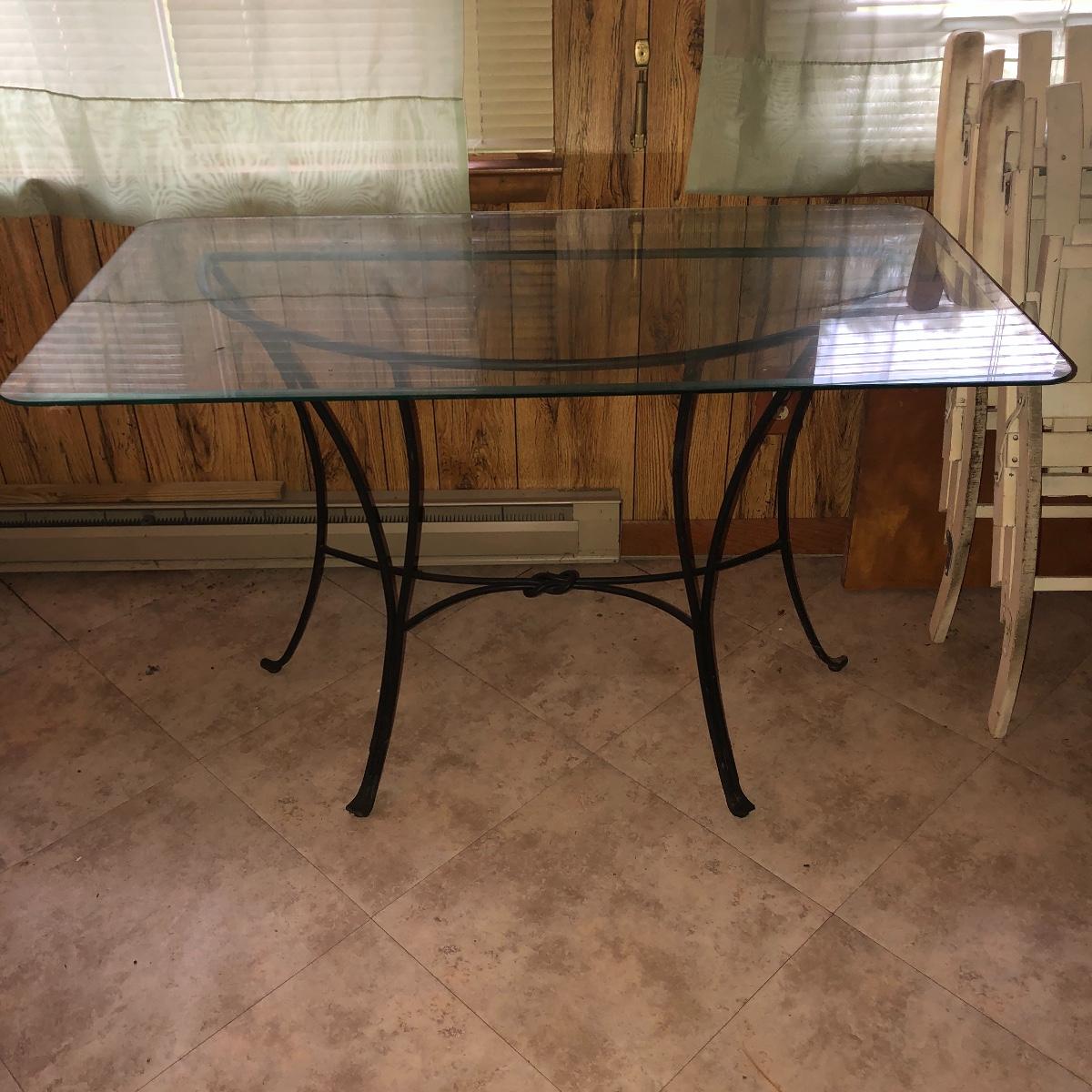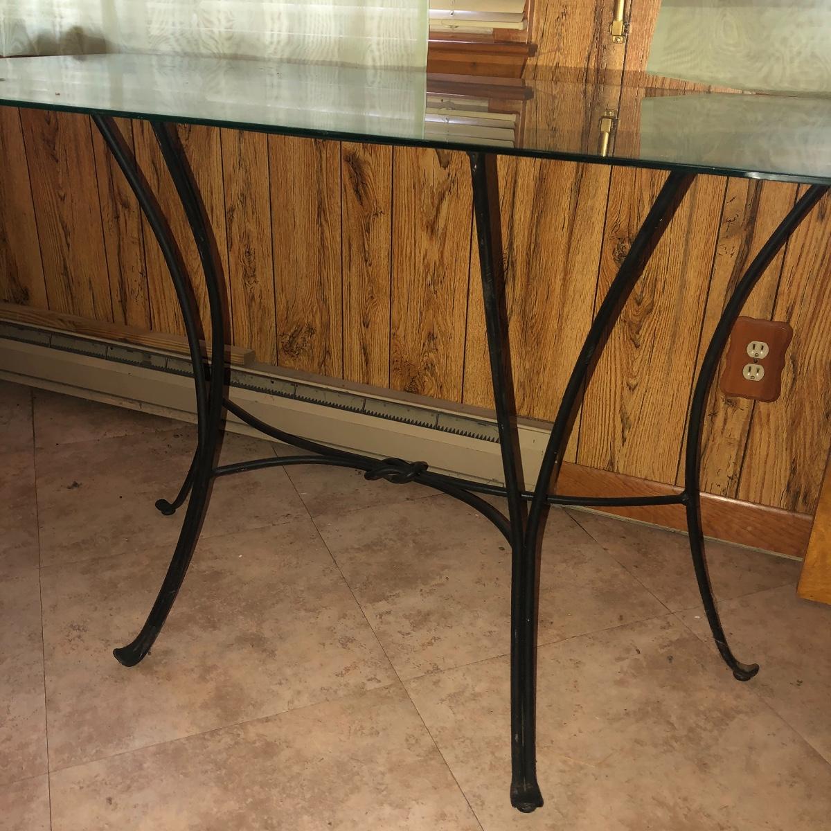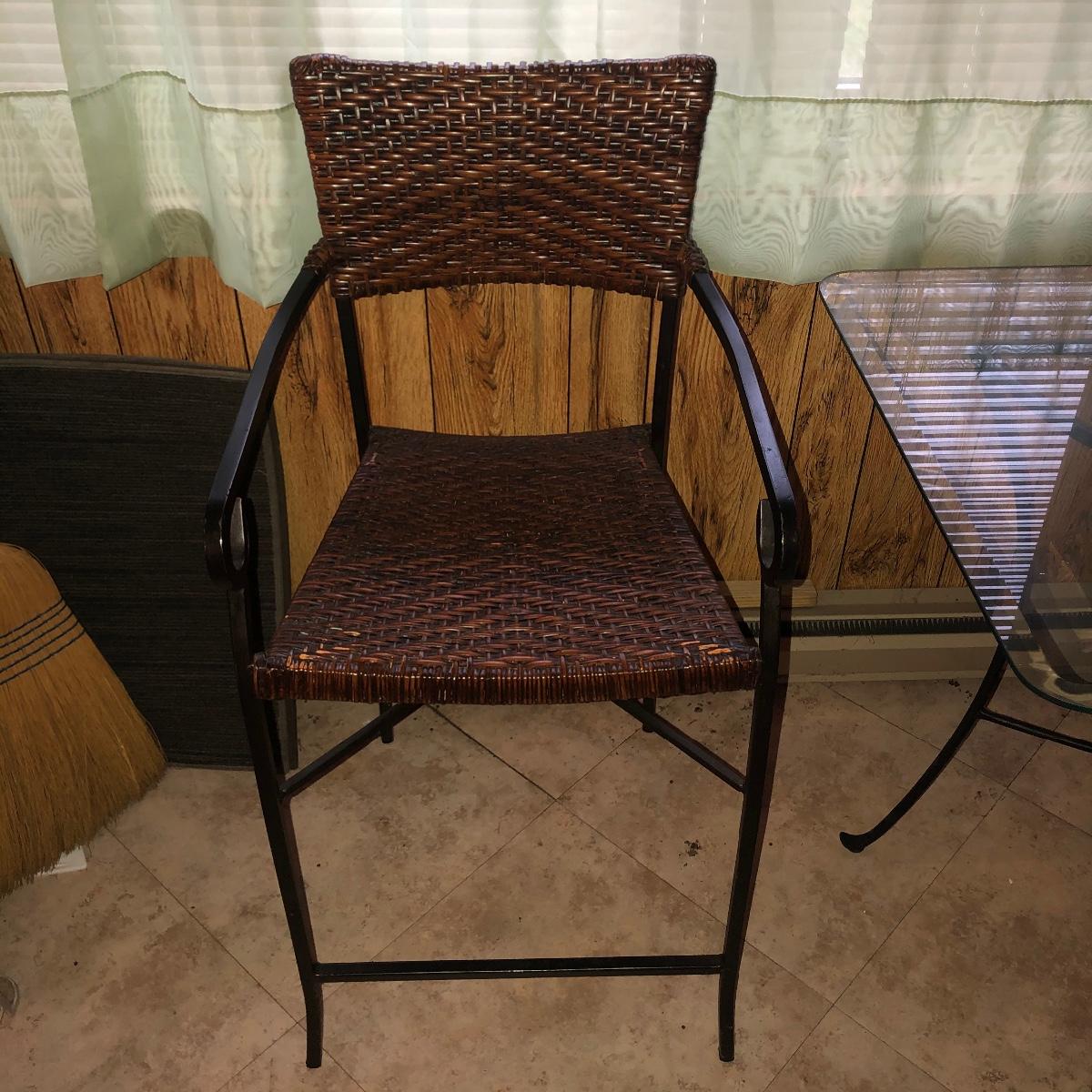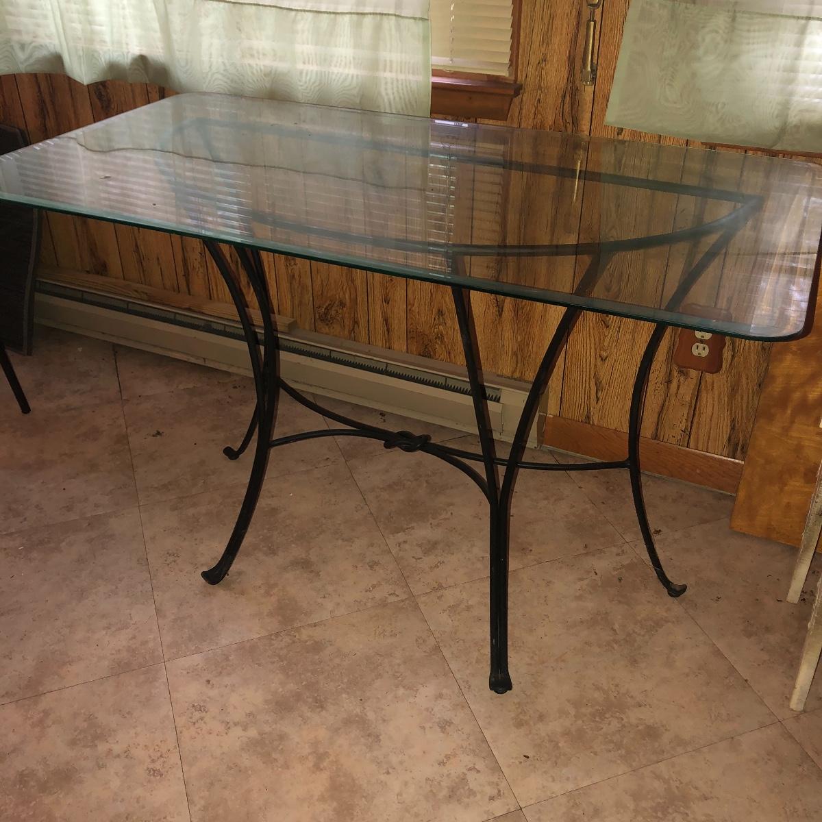 Metal based table with a removable glass top. The glass is 48” x 26” with the tabletop height at 30.25”. Both stool chairs have woven seats and backs with iron frames. These measure approximately 19” x 18” x 38.5” with a seat height at 24”.