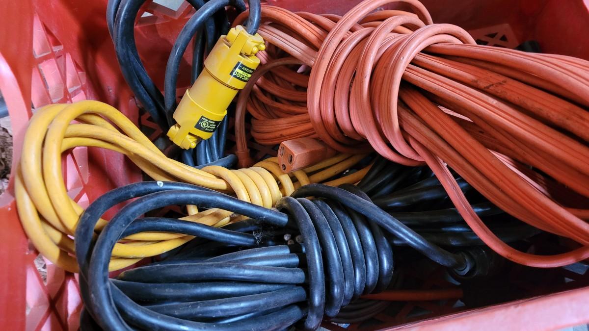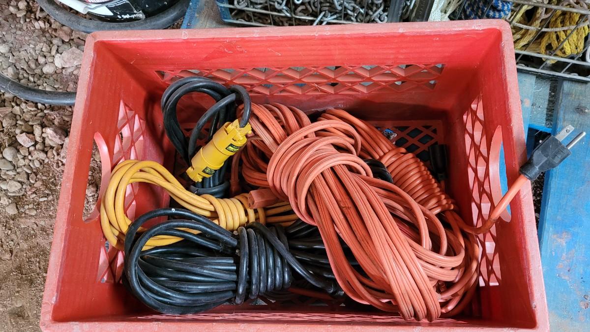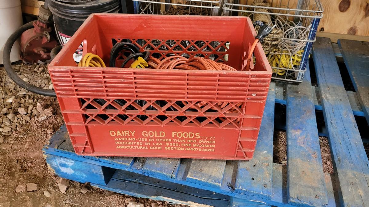Lot 54: Vintage Plastic Milk Crate w/ Outdoor Extension Cord Assortment