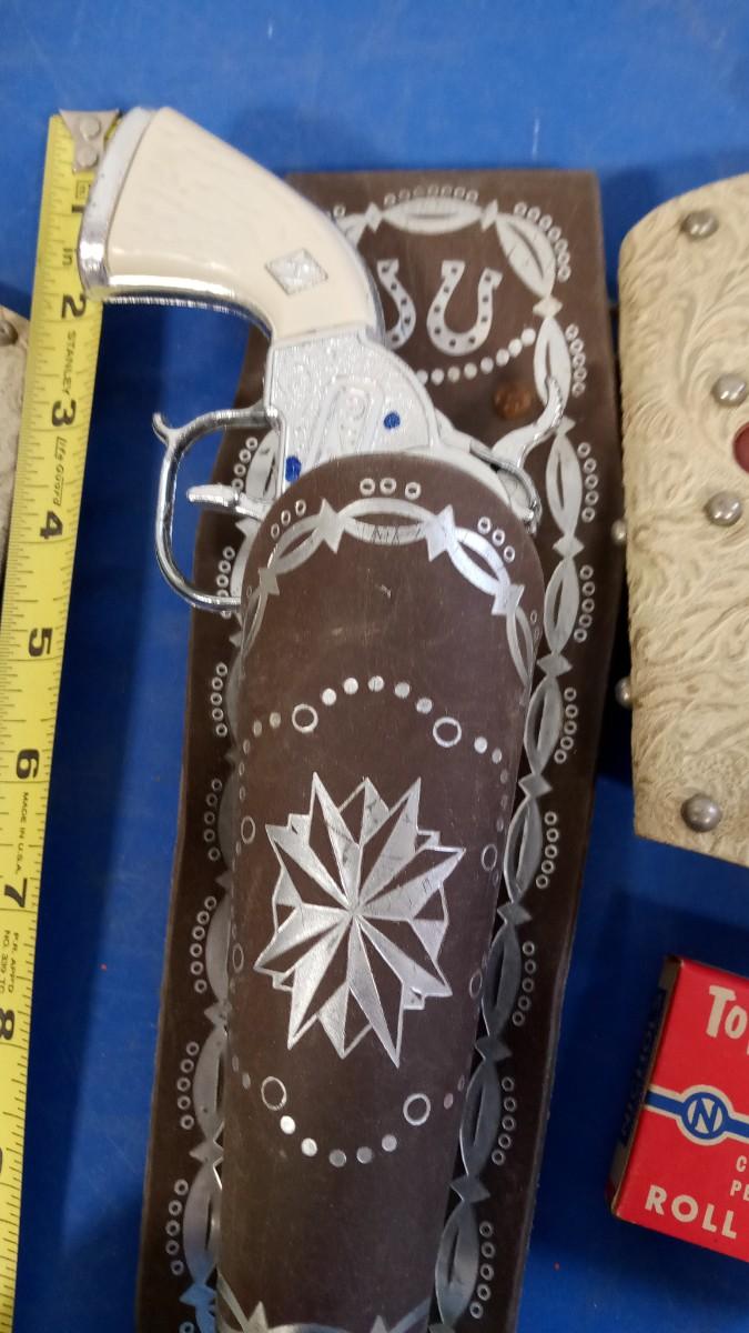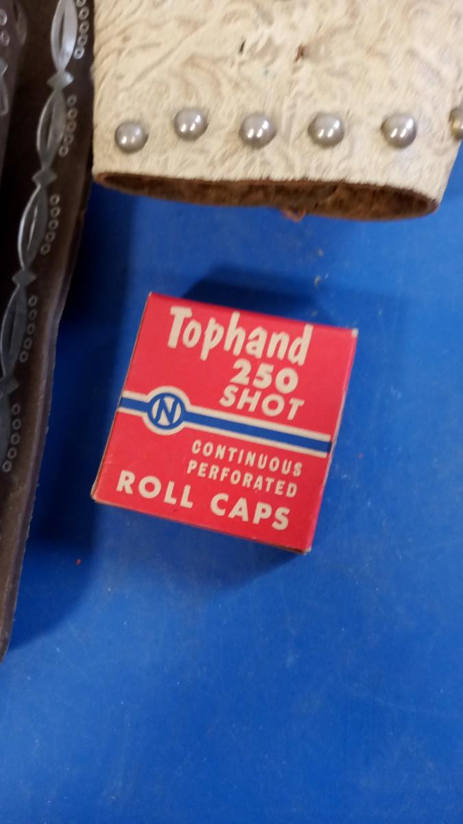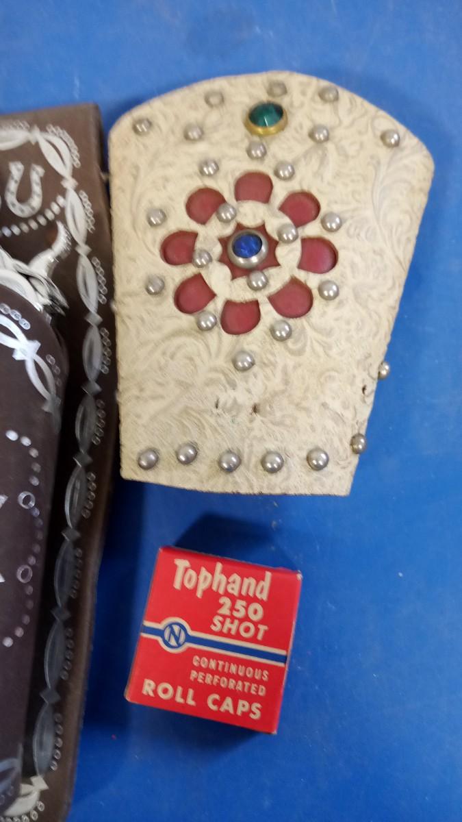 LOT 54 OLD CAP GUN HOLSTER AND WRIST CUFFS AND BOX OF CAPS