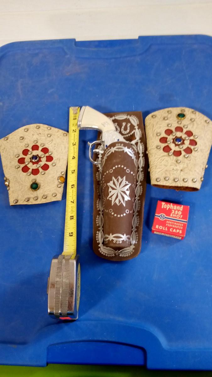LOT 54   OLD CAP GUN HOLSTER AND WRIST CUFFS AND BOX OF CAPS