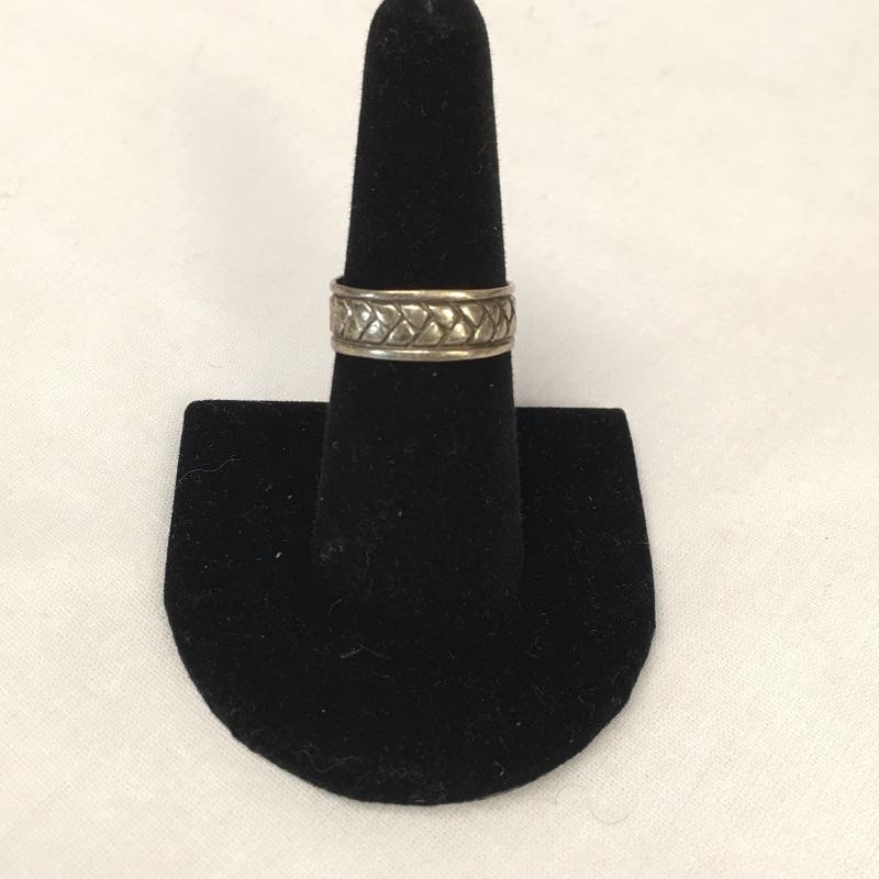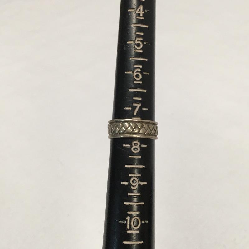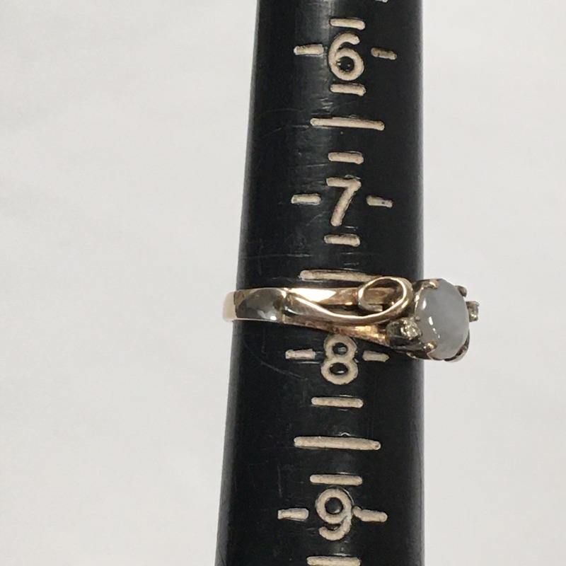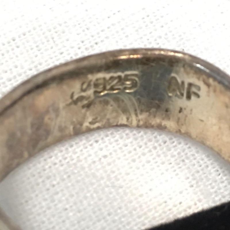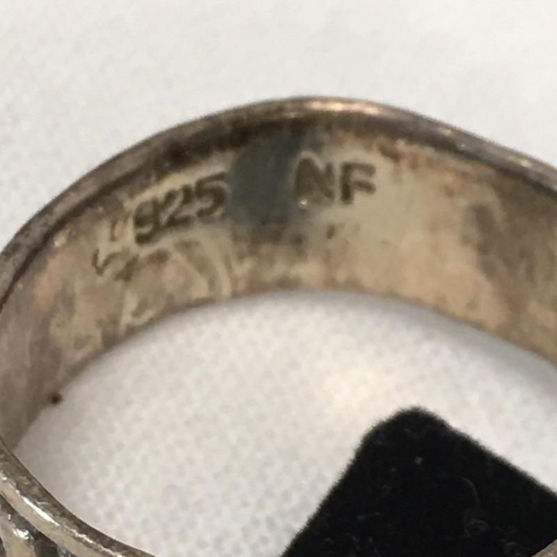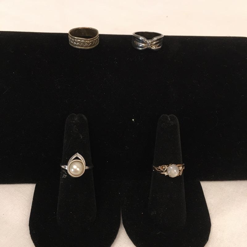 Lot of four rings includes a ring marked 925 with herringbone pattern, cinched ring with markings that are unreadable, an unmarked ring with pearl colored stone and an unmarked gold colored ring with two small diamonds surrounding an opaque stone.