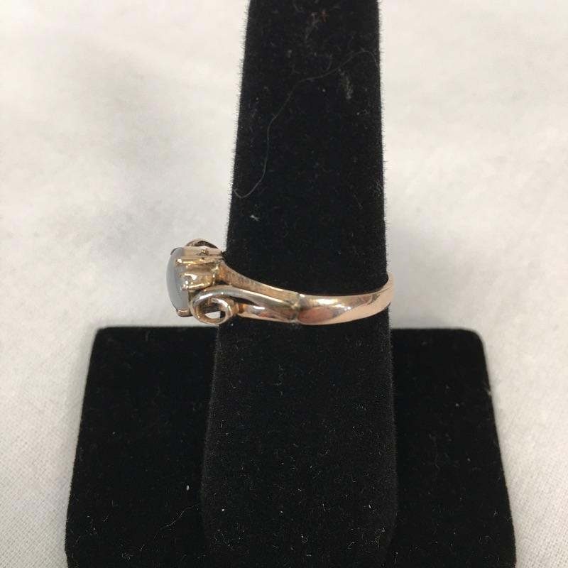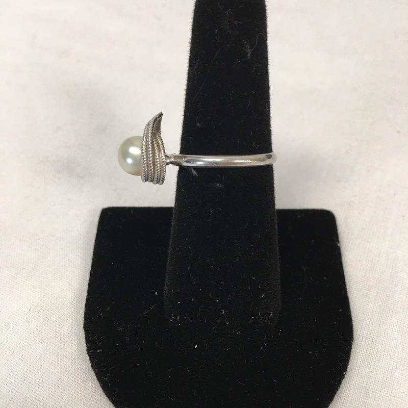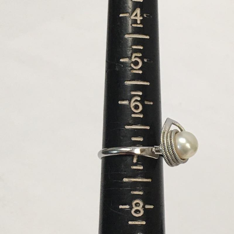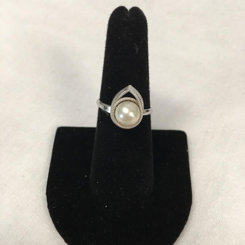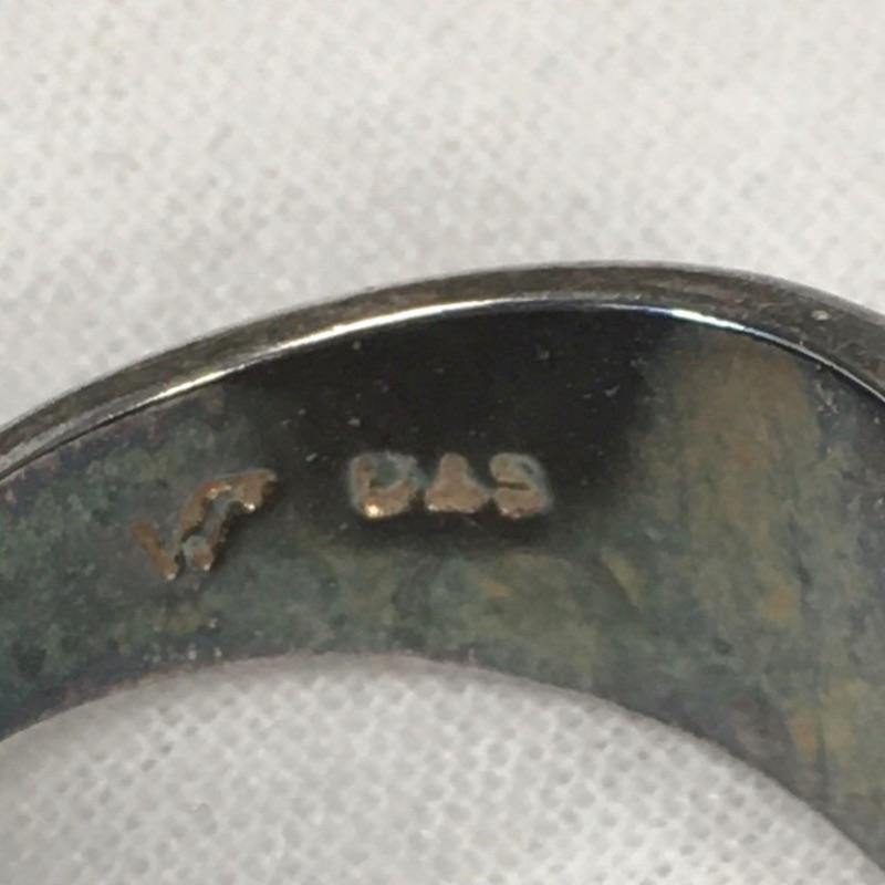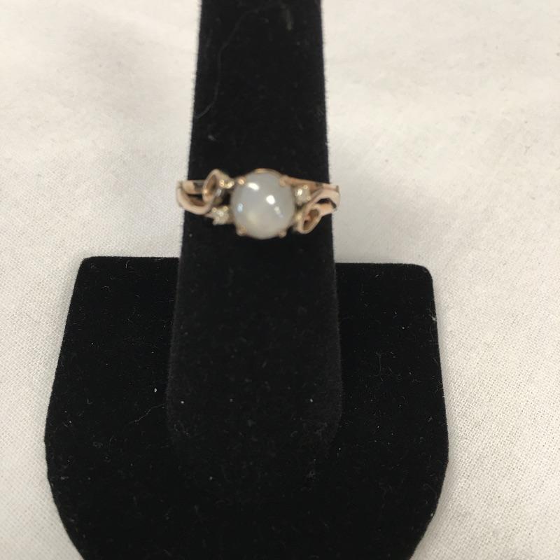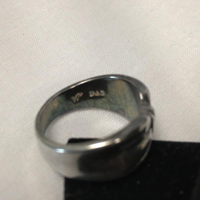 Lot of four rings includes a ring marked 925 with herringbone pattern, cinched ring with markings that are unreadable, an unmarked ring with pearl colored stone and an unmarked gold colored ring with two small diamonds surrounding an opaque stone.