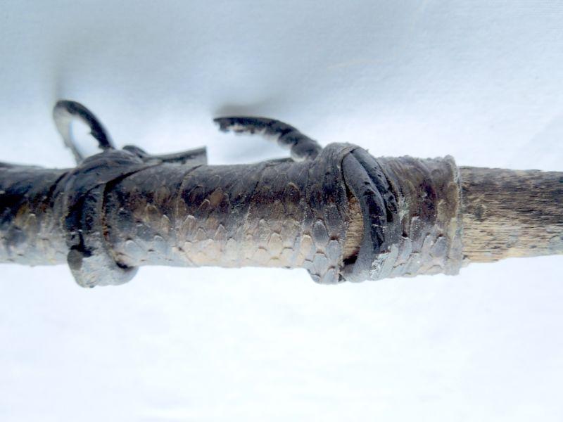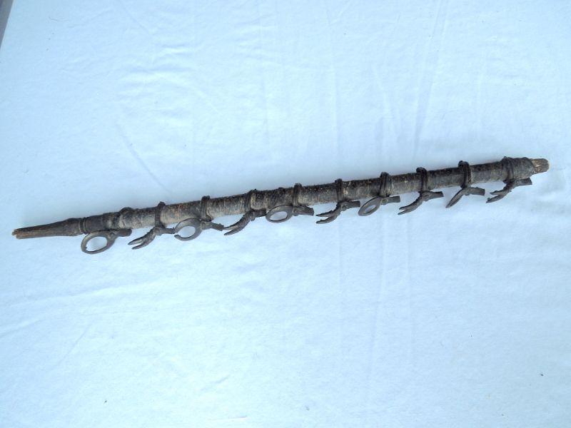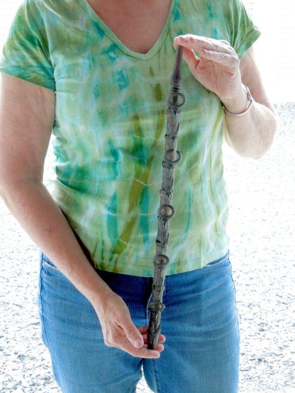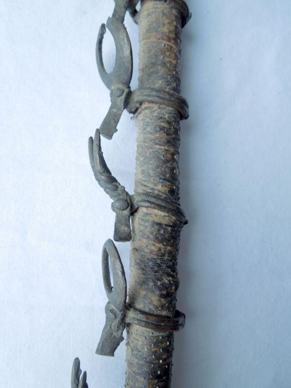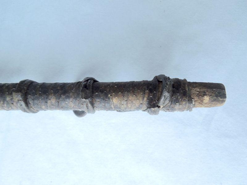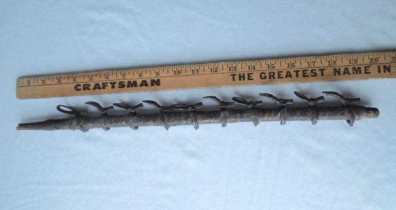 Fascinating piece wrapped in snake skin strips. Features 10 antlered brass ring animals. One solid piece, not hollow. 20" in length.