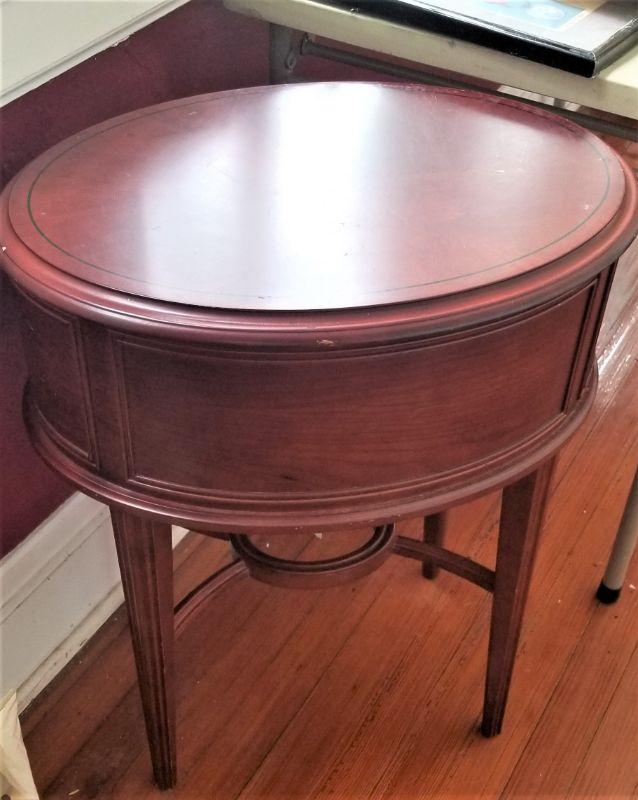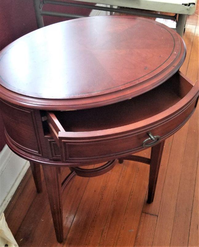 Cute Bombay Company Round side table in the antique style, three drawers. Used condition, a few small dings. Still good looking. Measures 22" x 16" x 26.5" tall.